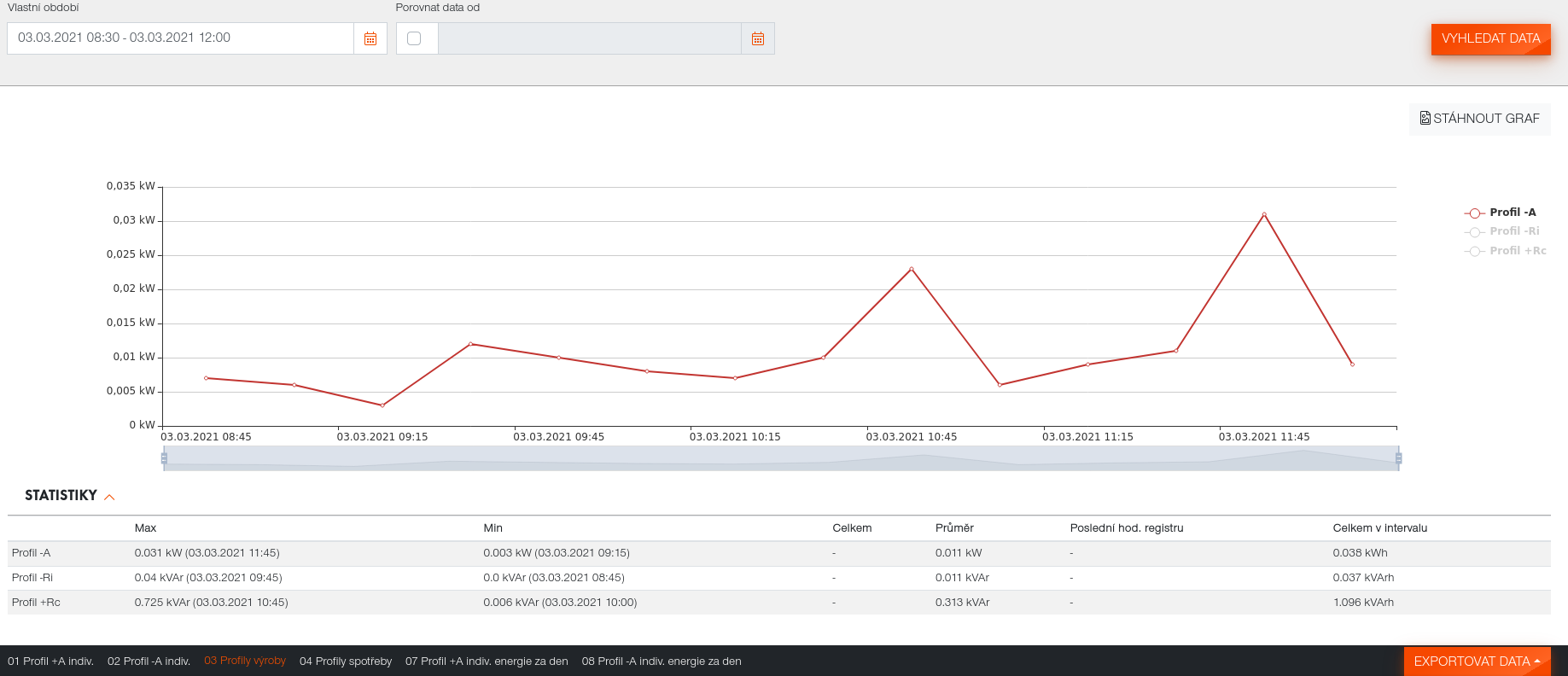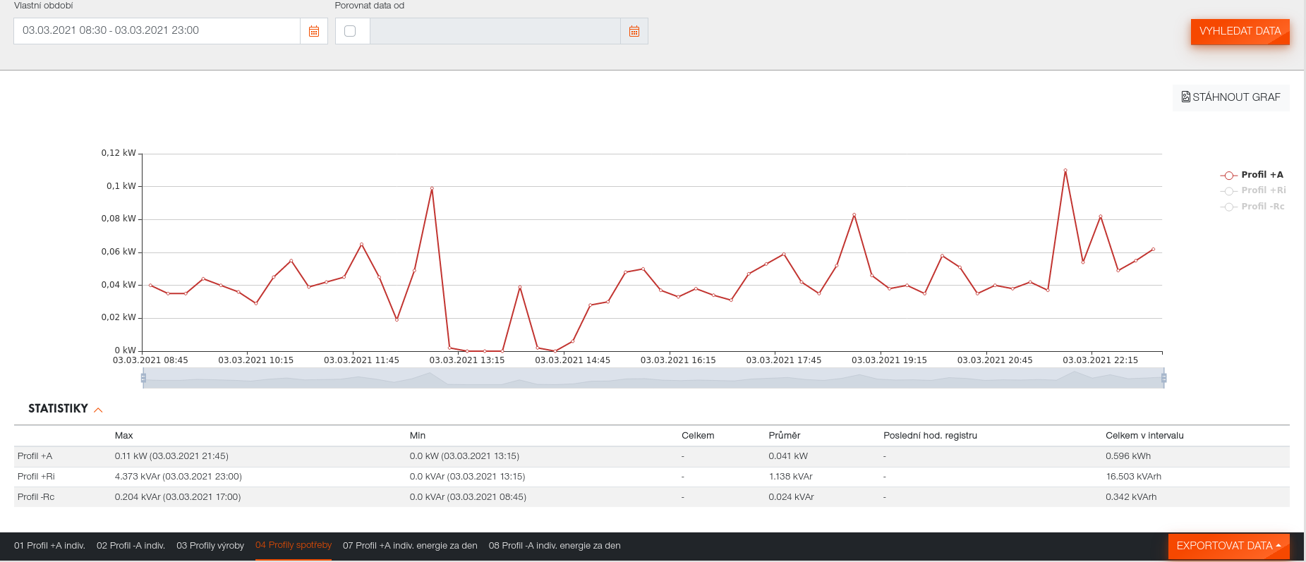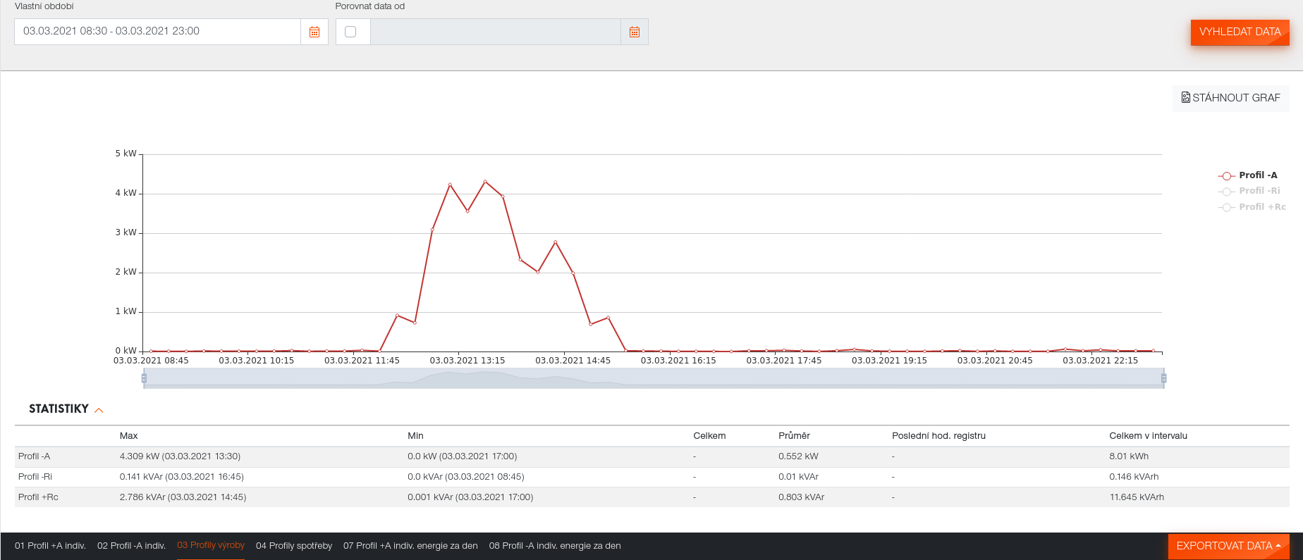 První 4 grafy jsou z distribučního fakturačního elektroměru vytažené z distribučního portálu, jak to vidí distributor. Jsou to průměrné 15 minutové hodnoty.