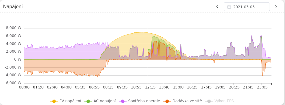 Jak to vidí distributor v den 3.3.2021 kdy svítilo celý den slunce a v 12 hodin došlo k nabití akumulátoru a v 15:30 začalo jeho vybíjení a v 23:00 byl již vybitý a střídač se potom uspal.