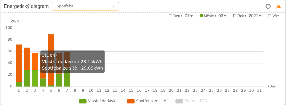 Výroba Spotřebováno bylo 28,15kWh a do distribuční sítě bylo dodáno 8,05kW, celkem vyrobeno 36,2kWh