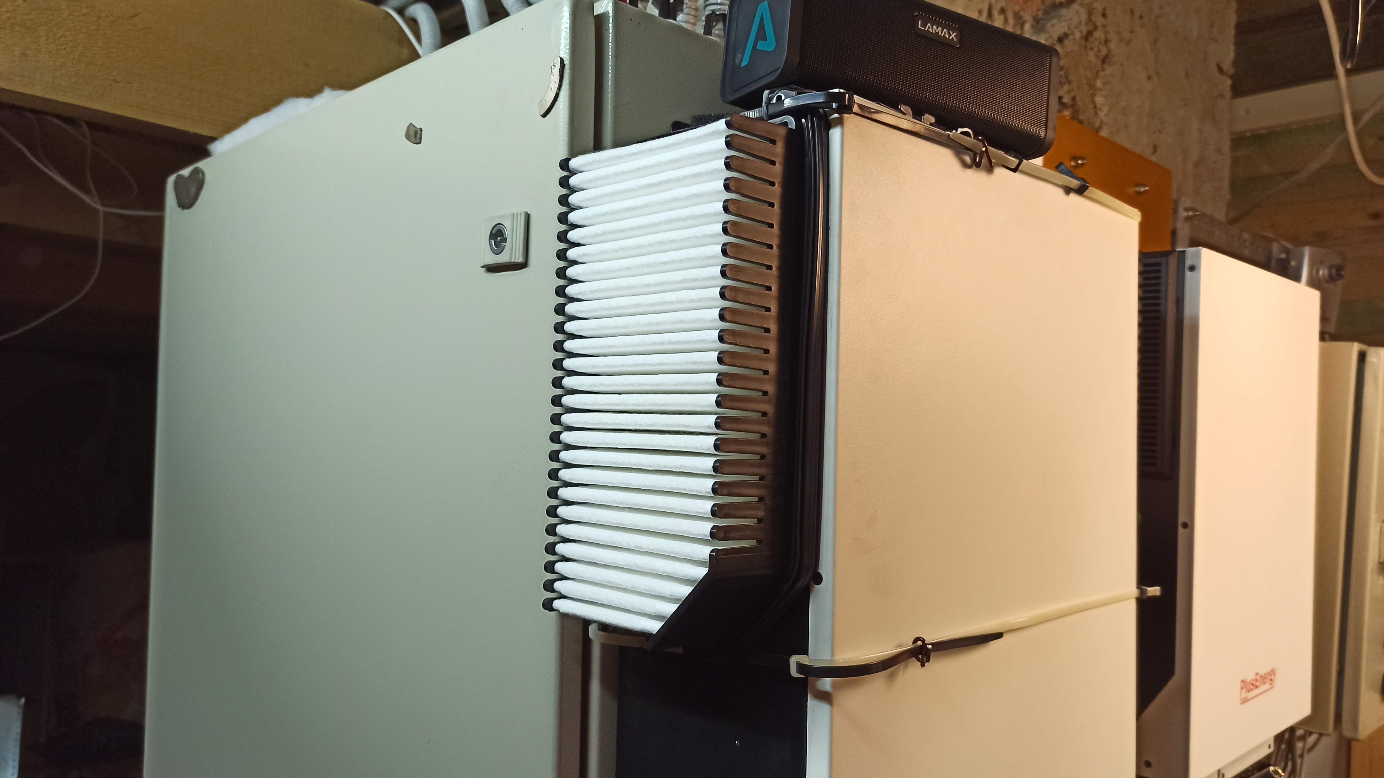 jelikož mám měniče na půdě, kde není úplně ideální bezprašnost, chtěl jsem něčím nahradit ty originál filtry co jsou na vstupech axpertů, nejdřív jsem použil textilní vložky do průmyslových filtrů ale nějak se mi nelíbil ten formát uchycení, pak jsem zkusmo nasadil Vzduchový filtr (motoru) prvotně jsem nasadil již použitý z auta a po kladném vyzkoušení, že se nezvedli otáčky větráků (zvýšený odpor vzduchu) ani provozní teplota, koupil jsem tyto filtry nové a takto to vypadá