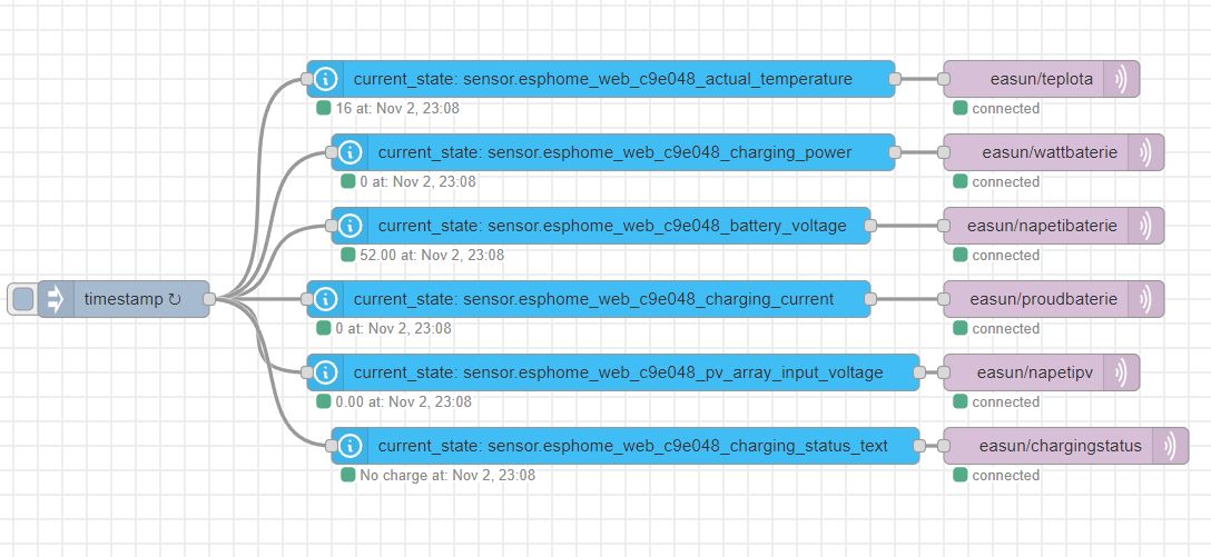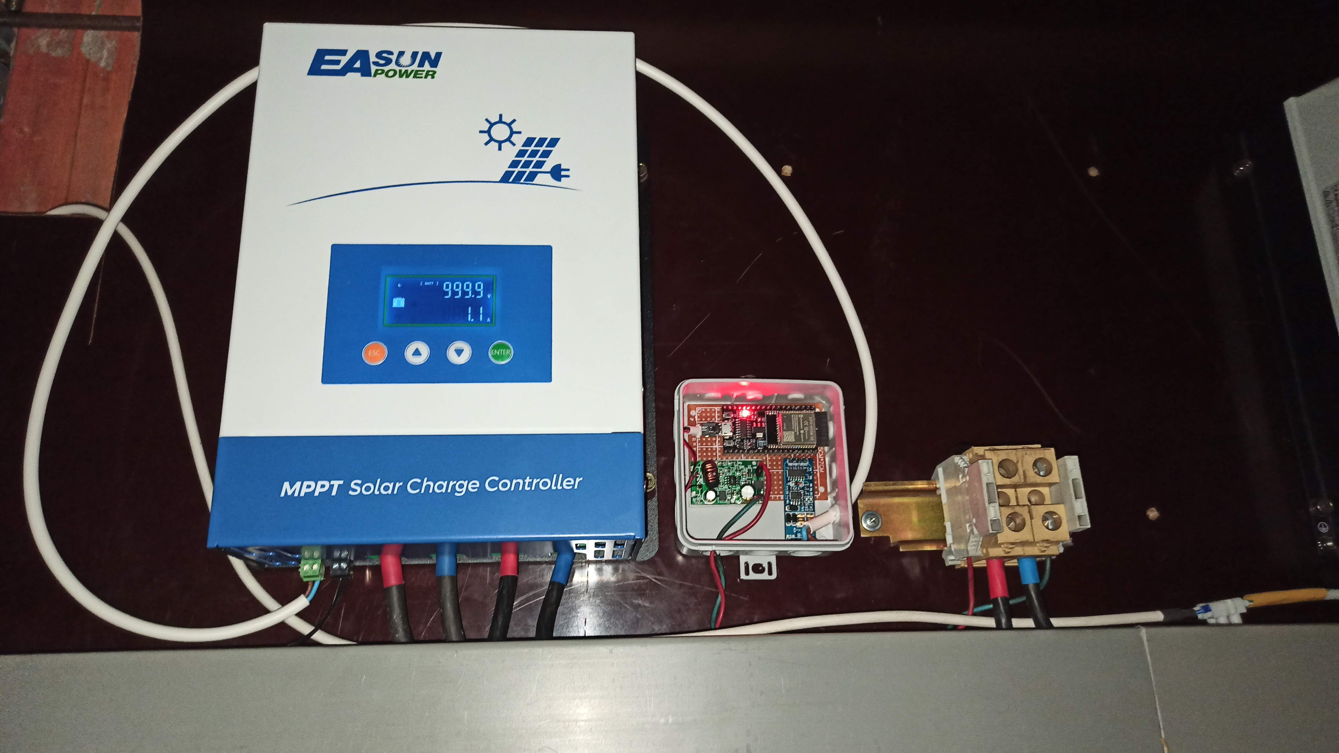 Jelikož ještě nenastal ten správný okamžik k zapojení druhého kinga a protože regulátory by už takové přepanelování nedaly, pořídil jsem si "náhradní" regulátor easun 8048, zatím v náhradním zapojení bez vyčítání dat prostřední nezapojené místo je připraveno na druhý epever, který zatím běží vedle v rozvaděči,