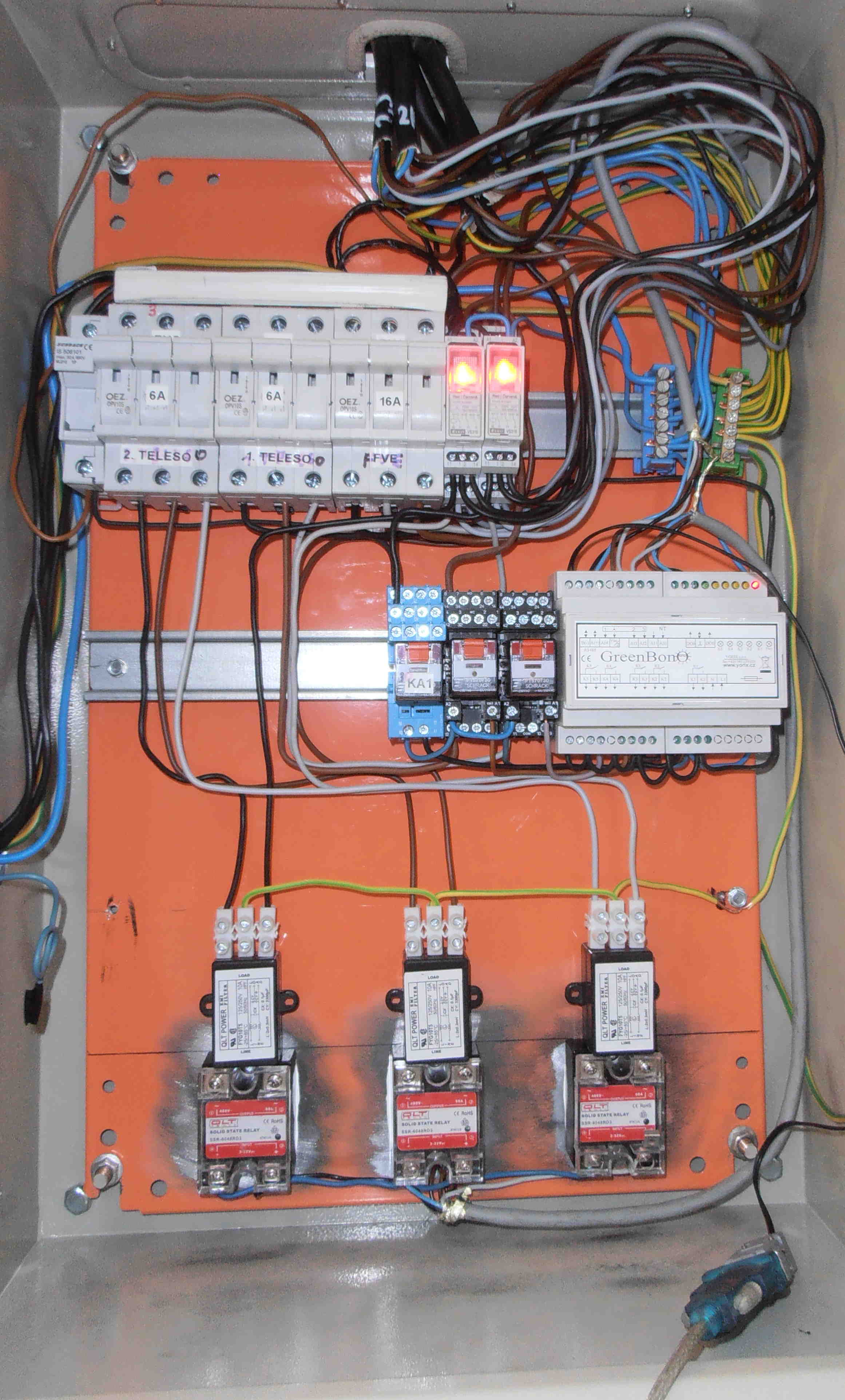 GreenBono zapojeno pro fázovou regulaci u testovací FVE 12kW (z roku 2010 bez licence/dotací). Maximální fázový výkon 3,2kW. Testovací provedení, estetickou stránku provedení a popisky prosím neřešte.