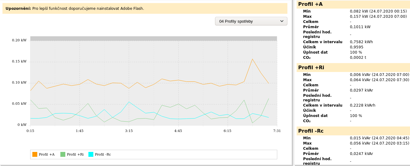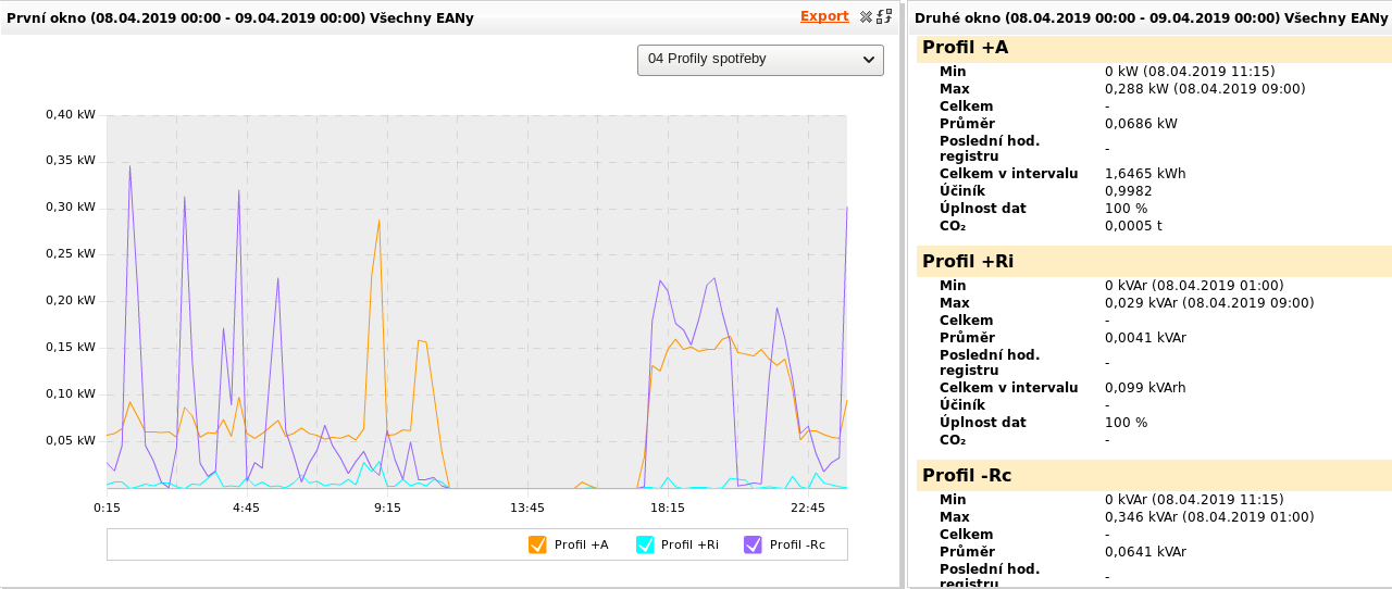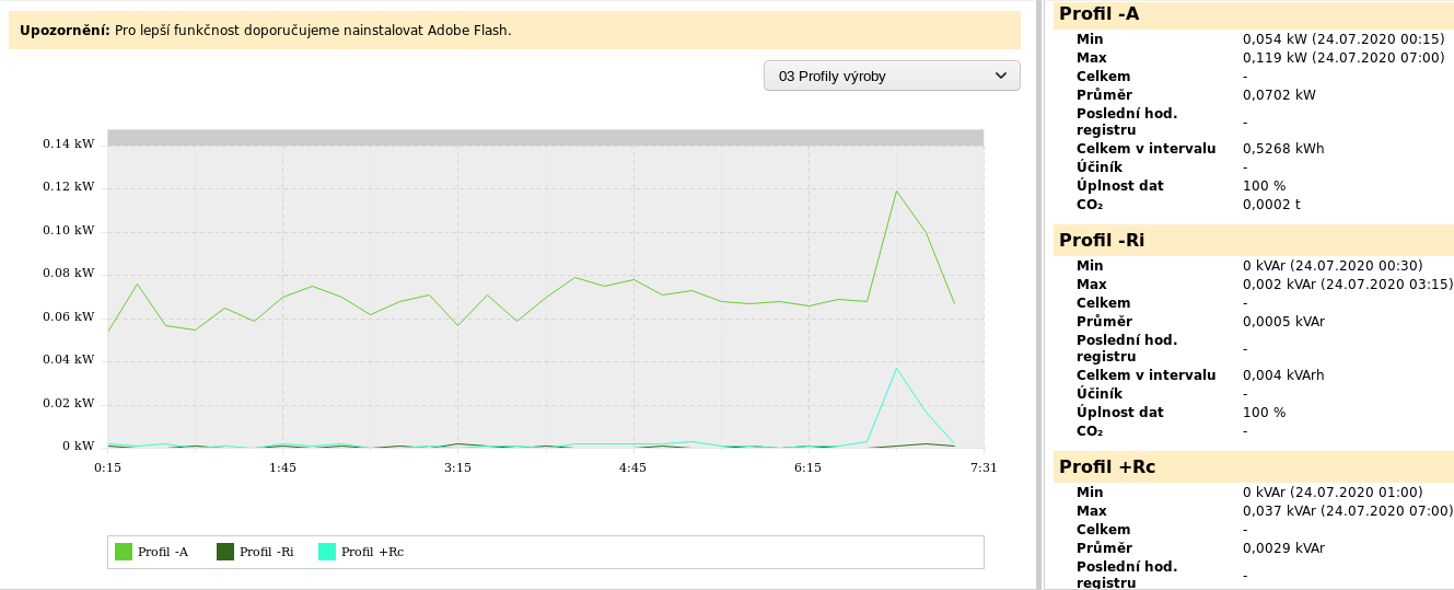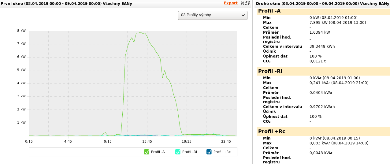 Z pohledu distributora to vypadá takto Podle distributora byla za stejné období spotřeba 0,7582kWh při průměrné spotřebě 101,1W, ale zároveň byla ve stejné době i dodávka