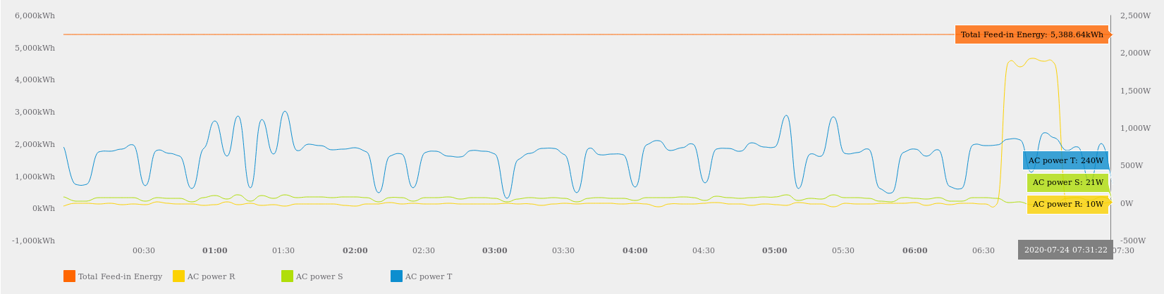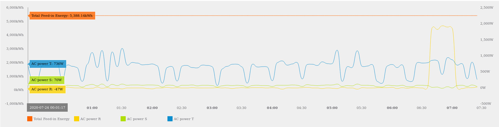 akumulátor střídač Feed-in power je výkon do/z distribuční sítě měřený elektroměrem který je připojen ke střídači. Pohybuje se od 0W do -74W do 10:38 kdy je zahájena dodávka přebytků do sítě. Zvláštní je že spotřeba kolem 150W od 17:45 do 22:30 kterou naměřil elektroměr distributora zde vůbec není na křivce Feed-in power vidět. Jde tam jen vidět že střídač pokrýval spotřebu kolem 1,5kW, ale podle elektroměru distributora ji nepokrýval dokonale, ale podle elektroměru přípojeného ke střídači ji pokrýval dokonale.
