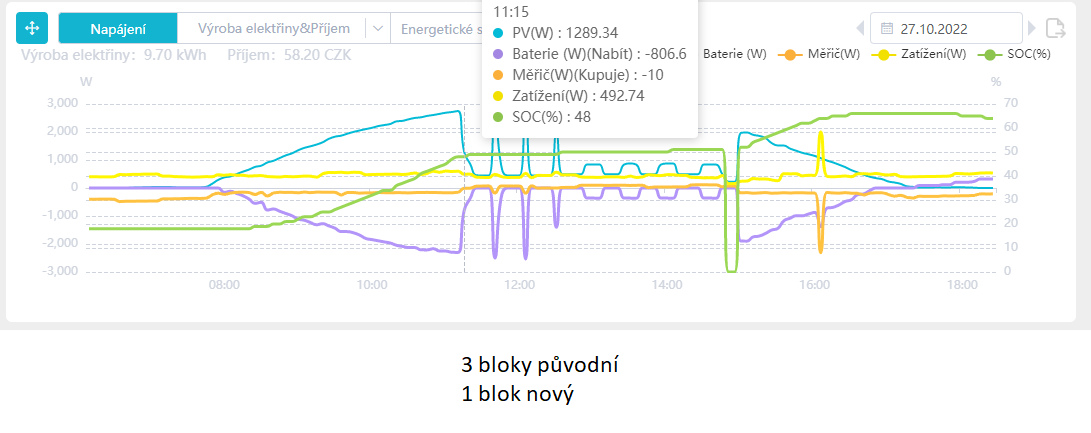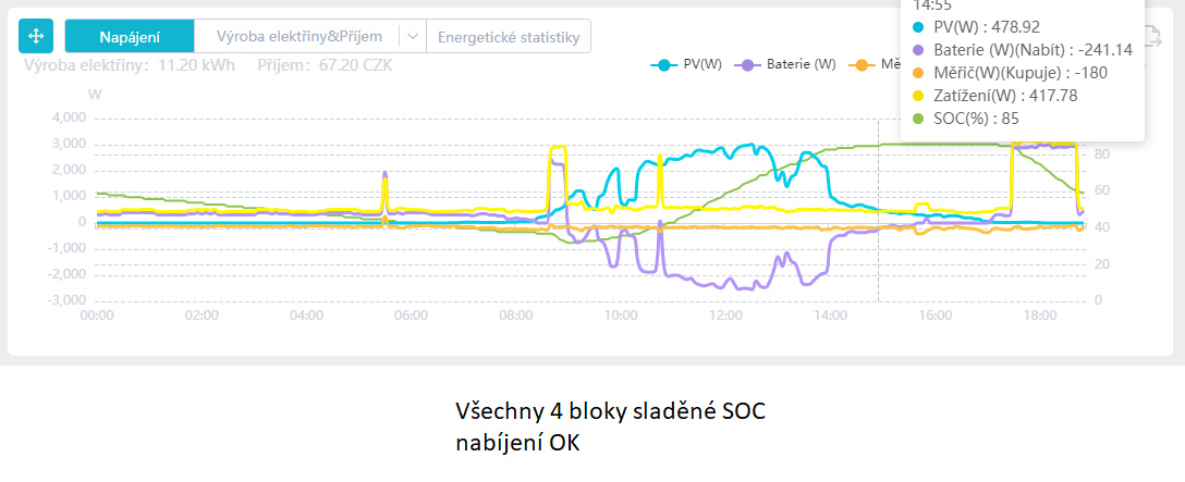 graf kdy byly bloky rozladěné. Zelená SOC se zastavila na 50% a konec. Pak už to jen oscilovalo, zkoušelo dobíjení těch 3 původních, ale 4 nový blok to brzdil, protože byl nabitý. Prostě rozladěné SOC o 50% masakr.