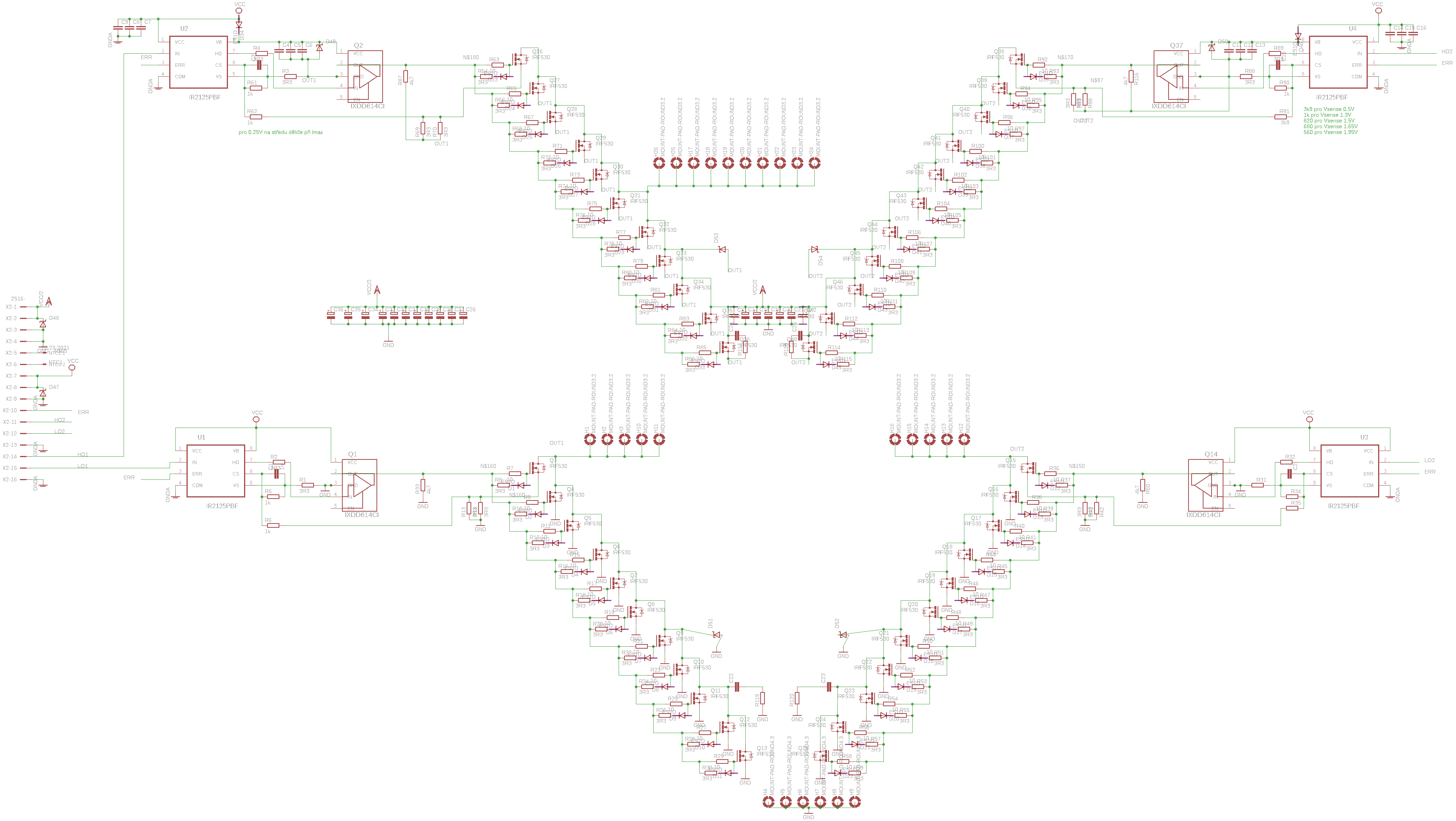 Vdaka za schemu mostika - nepamatam sa na jej uverejnenie. Pokial tomu rozumiem 11-ty MOSFET nahradza diodu ktora je uvadzana v aplikacnych listoch IR2127. Aá... teras som na scheme zistil, ze nepouzivas budice IR2127 ale IR2125. Aky to ma dovod? IR2125 odpovedaju na chybovy stav inym sposobom ako IR2127...