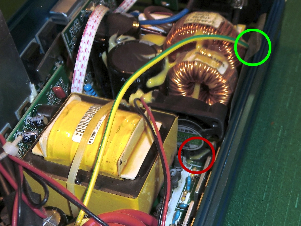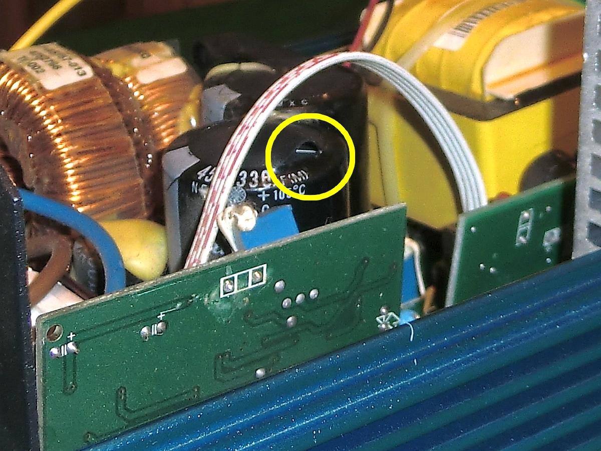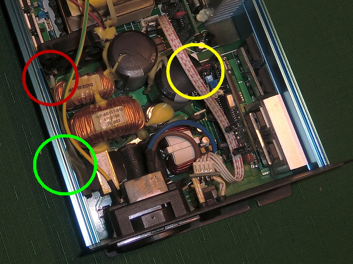 Čo sa stalo, vidieť na priložených obrázkoch. Červenou som označil miesto, kam sa na stator dostala tlmiaca hmota, ktorá znemožnila pohyb rotora. Je záhadou, prečo sa tak stalo pri minimálnej záťaži nad ránom o 4:30, keď bol pripojený jediný kompresor s príkonom 45-55 W. Je teda nepravdepodobné, že stiekla dolu z toroidov v tom čase, ale vysvetlením by bolo, že sa stárnutím plastu deformoval vetrák, alebo prach dokonal svoje medzi lopatkami a lízancom onej žltej hmoty. Vetrák nechladil a menič vyhlásil alarm z prehriatia. Zelenou je označený izolačný papier, pravdepodobne úmyselne privrznutý do profilu hornej a spodnej časti skrine meniča a žltou podozrivo vykrivené plastové čelo kondenzátora, ten sa však zdá byť v poriadku.