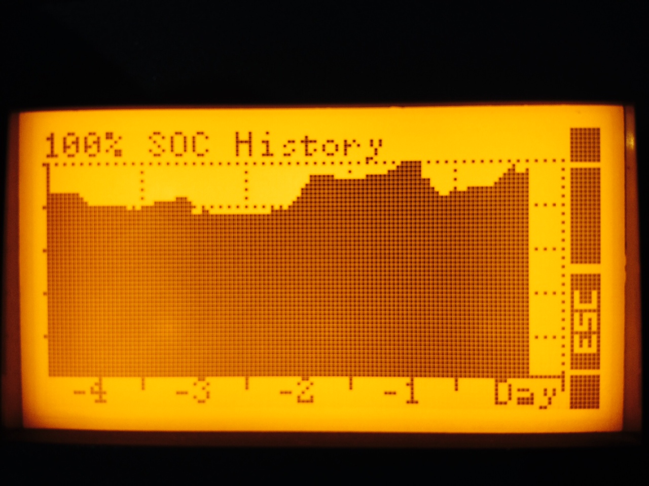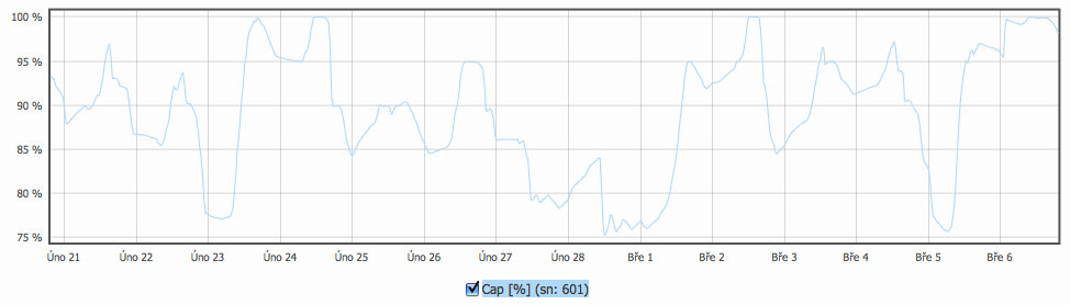.. a ještě jeden krásný graf kapacity našeho domácího akumulátoru 1000Ah/48V za delší časové období zobrazeným díky Solarmonitoru, který nám již umí zobrazovat mnoho veličin včetně kapacity přímo online za jakékoliv časové období.