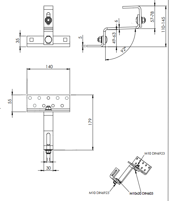 střešní hák Solar Vario - variabilní se skládá z tl. plechu 6mm nebo 5mm , nerez nastavitelné díly , tl. plechu 5mm(4mm)nerez deska k přichycení na latě.