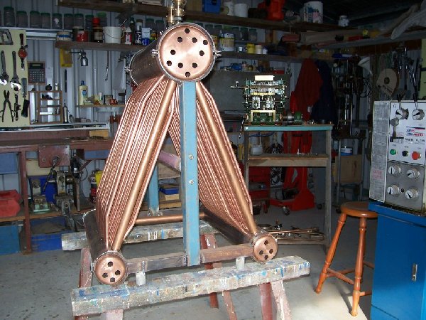 Nic z toho není tak jednoduché zprovoznit pro ohřívané médium olej, protože žár hne se spoji a tvoří se tak díry. Vodní a parní výměník snadno zastoupne oxidem železitým nebo kotlovým kamenem, tzv. černiskem z potrubí nebo sanytrem, ale pokud tam naleju olej, musí to být spojeno olejotěsně a to na vysokou teplotu. To lze dokázat stočenou trubkou, do průměru 1´´, ale musí být z nerezu, přímo u ohně a s nuceným oběhem. Takto vypadají jedno nebo dvouvrstvé výměníky nad krb. Ale jsou dost drahé a nedokážu si opět představit jak řešit tu cirkulaci přečerpáváním nebo samotíží. Navíc, když by výměníky musely být alespoň dva protože za olejovým prochází až 300°C.