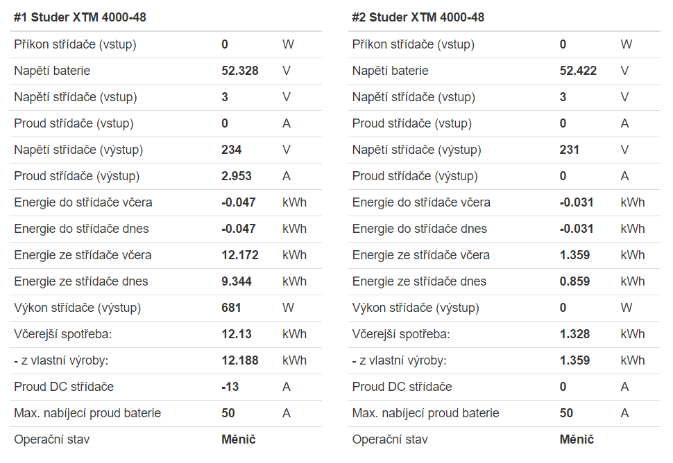 Ano Druhý Studer jen vyčkává a když začne stoupat odběr z prvního Studeru myslím nastaveno asi na 80%začne mu pomáhat drudý.Ten ale jede hodně málo.To střídání jsem nikde nenašel.Ani mě to zatím nenapadlo.Určitě by to ale šlo,když by výrobce toto přidal do nastavení.redcrown píše:Ano, chápu že tu zatím asi není trh. Skutečně jsem myslel napětí nad 120V. Vždyť na 120VDC jeden i velká část větších UPS zařízení. Možná se na 48V systém budeme za několik málo let dívat jako dnes na 12V:) Ok, u MPP nabíječů by se u Midnight dalo jít na 120V. Jestli jsem dobře koukal, tak např. u Victron je s vysokým napětím bída.