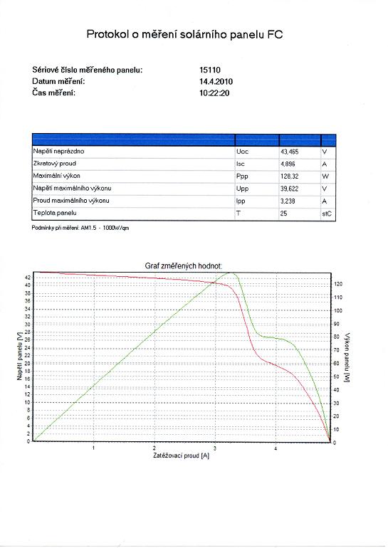 1. panel je v pořádku , při zátěži 3,7Ohmu (39,7Vmp : 7,97Amp = 3,7Ohmu) naměřím při jasné obloze a kolmé pozici panelu k slunci 35,4V a 7,25A což by odpovídalo štítku .