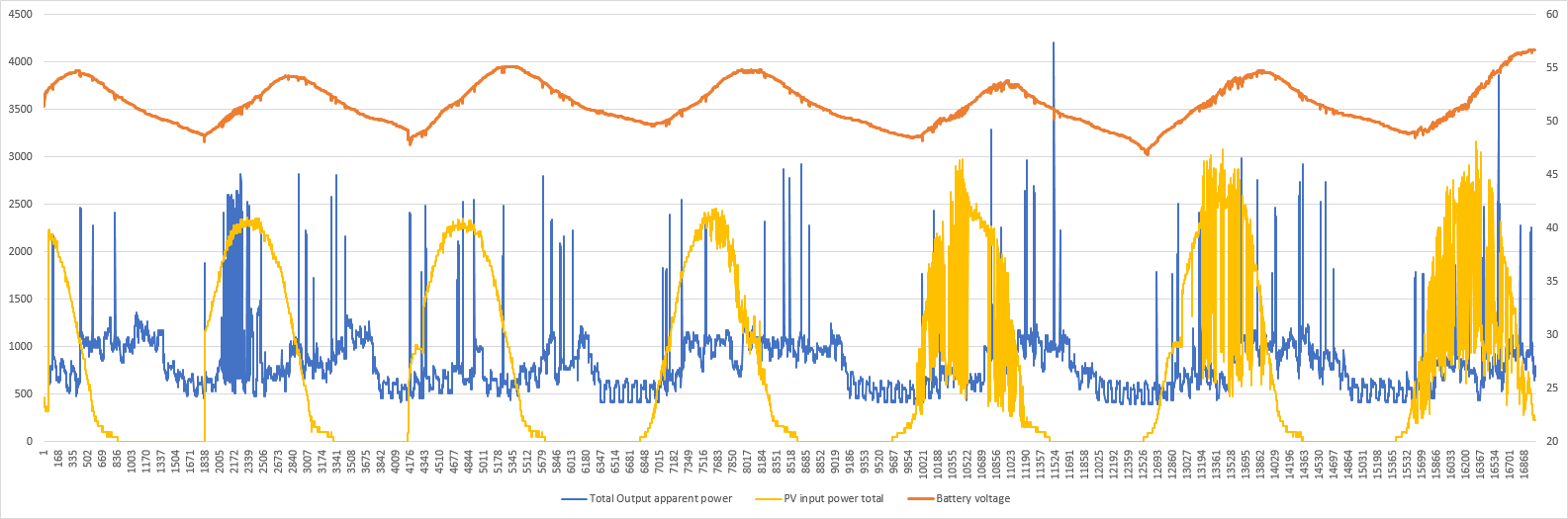 Labák v skúšobnej prevádzke. Na streche 12x285Wp Amerisolar + 18x235Wp repasovaných LDK + na garáži 6x235Wp repasovaných LDK. Celkom 9060 Wp. Pripojené sú momentálne PIP1-3S4P Amerisolary, PIP2- 3S5P LDK, MSB1- 3S1P strecha, MSB2- 3S2P Garáž., 2x PIP5048MK paralelne, , 2xMakeSkyBlue 60A . Aku Li-ion 18650 Skladačka 60P14S + 6x LG 28P7S bloky = 21kWh využívaných cca 16 kWh, 4x ANT BMS 320A. Sledovanie zatiaľ staré miniPC s Watchpowerom.