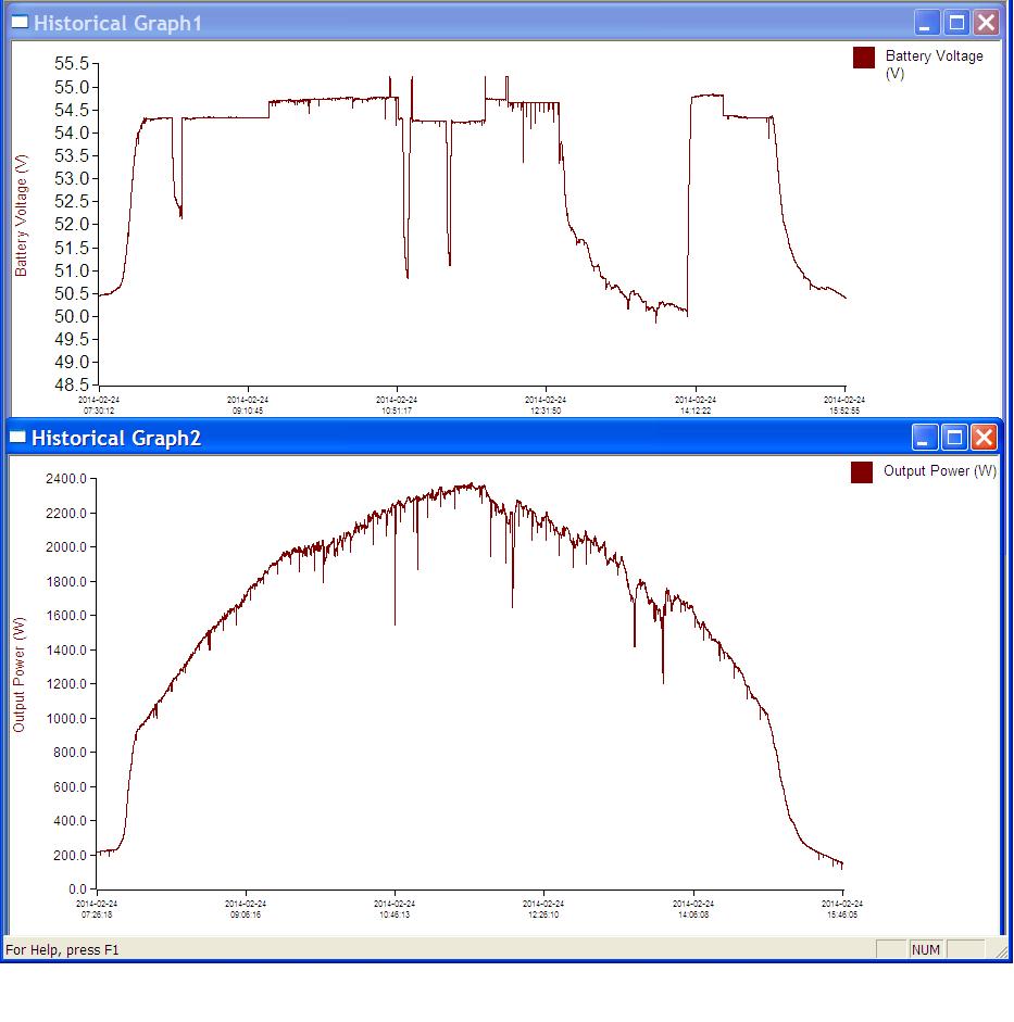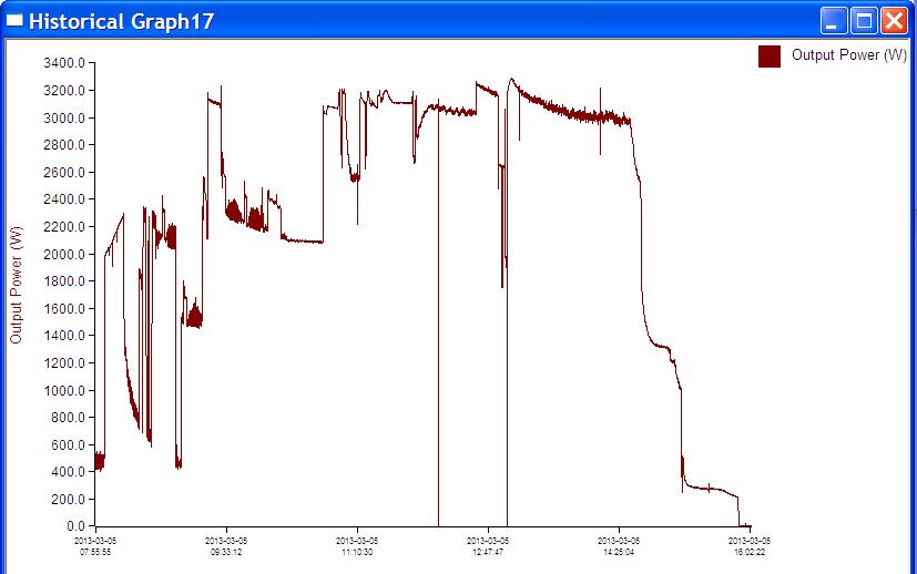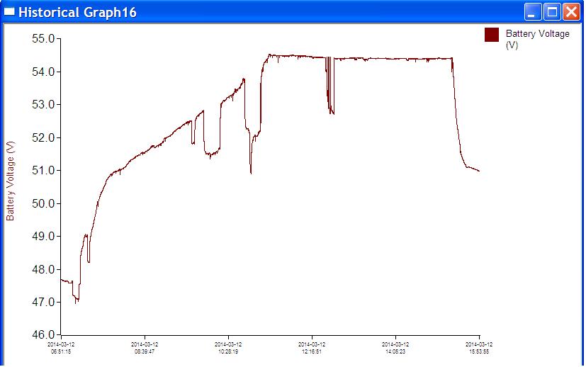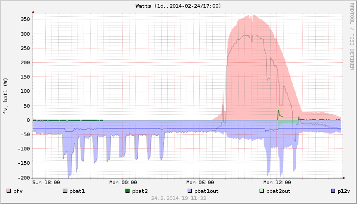 Krásně jde na tomhle grafu vidět, jak od oběda, kdy bylo nabito, spadl bateriový výkon, ale solární výkon tekl dále do vody. Resp. jde vidět, kolik výkonu by nebylo využito, kdyby nebyla spotřeba přebytků. Ten čas bez výkonu je čas, který potřebovala baterie k poklesu napětí z absorpčního na udržovací.