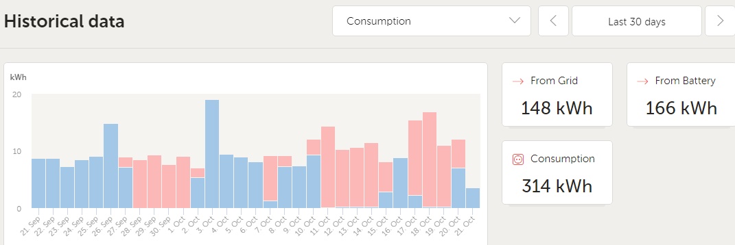 Průměrná říjnová výroba (za 8 let) je u mne kolem 636 kWh. Za uplynulý říjen bylo u nás tak málo slunečných dnů, že jsem vyrobil jen 355 kWh. Procento pokrytí spotřeby v tomto měsíci pokleslo na 36,7%.