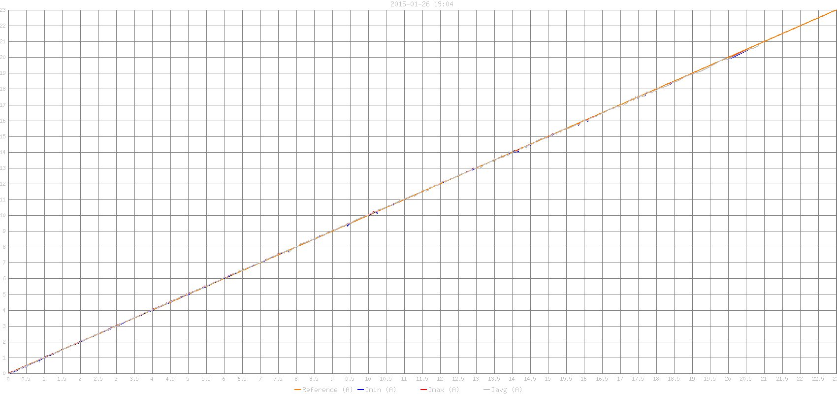 není to tak hrozné. Dával jsem paralelně k Pololu 0-30A 11 a kousek cm měděného drátu o průměru 0,6mm jako bočník, který se měl pohybovat okolo 2 mOhmů pro rozšíření rozsahu na 0-50A. Pak jsem to kalibroval v sérii se samotným původním Pololulkem a sedí to naprosto přesně (graf je průhledný, doporučuji tmavé pozadí):rob.brno píše:použití obyč. cu drát má nevýhodu teplotní nestability