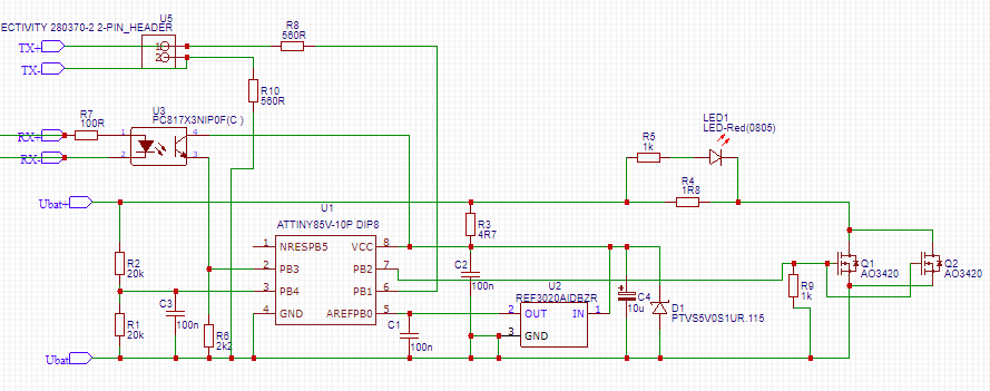 Jediný co můžu okomentovat, že jsem měřil spotčbu v režimu spánku, a asi jsem neměl všchno v procesoru ideálně vypnutý, to bylo cca 400uA při 3.3V. Ale je to pořád moc, reference přes odpor 47k by měla brát jenom 40uA a attiny podle tohoto by to mělo být 2uA na attiny. Že by tekl takovej zbytkovej proud balačním tranzistorem se mi nezdá. pokucd by ot bylo takhle, tak by mělabýt klidová spotřeba do 50uA... Při aktivním procesoru a odesílání dat je to nějakejch 8mA v průměru při 3.3V.