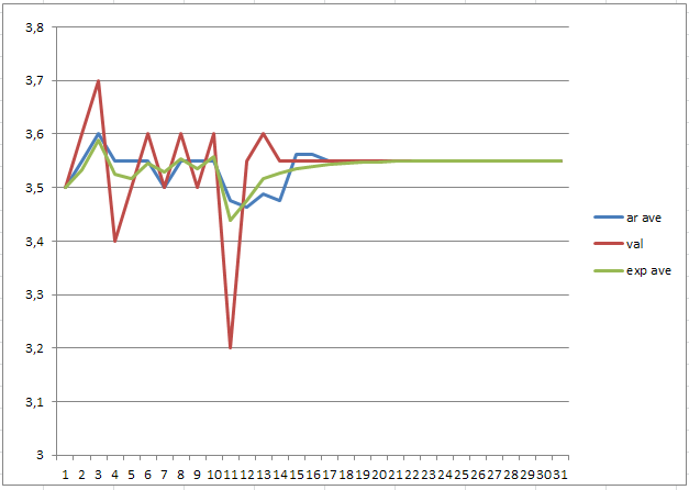 Simulacia vyzera takto (val - namerana hodnota, ar ave - aritmeticky priemer, exp ave - exponecialny priemer)