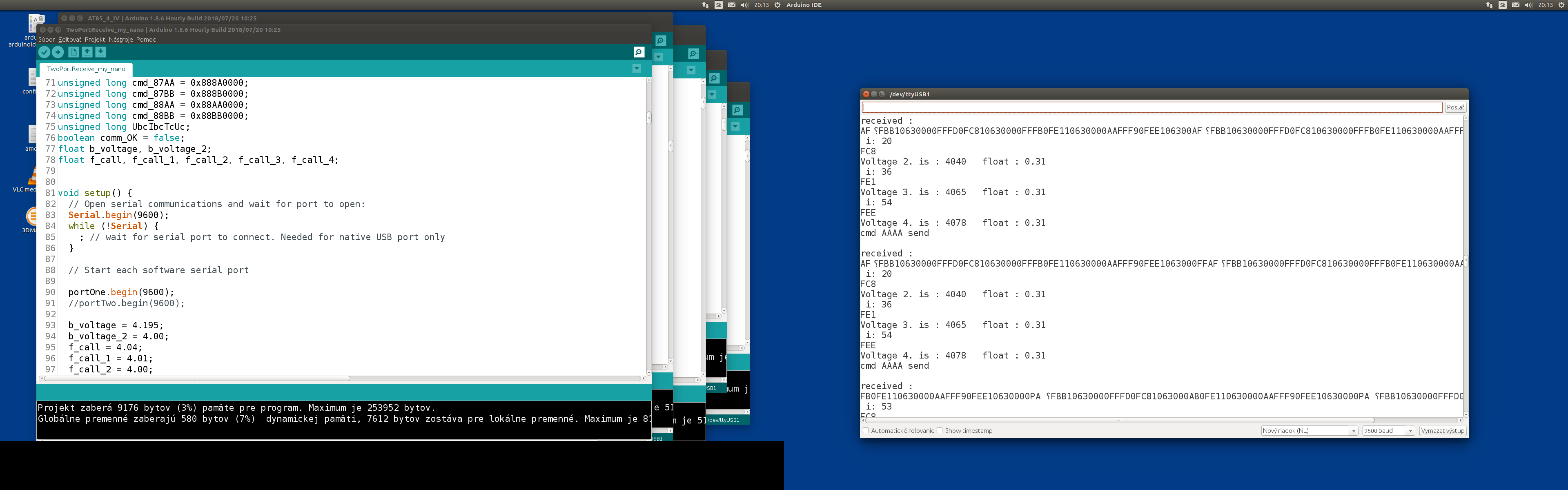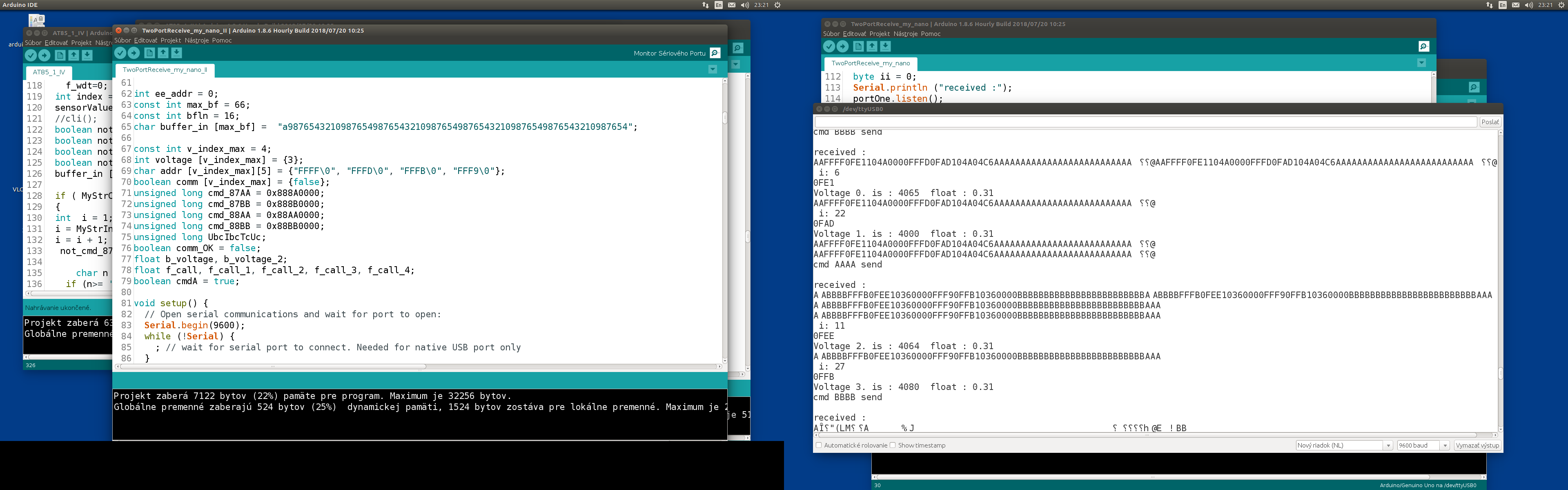 Priklad co som ti poslal bol len na testovanie merania a uspavanie s tym ze modul posiela udaje pre kontrolu a vie reagovat/preposlat prikazy. Komunikacia - moduly su zapojene seriovo (TR->RX modul TX-> RX modul TX ....) komunikacia ide jednosmerne. Rozdiel je v tom ze moduly data posielaju len na vyzvu a po jednom. Posle sa prikaz (paket) na danu adresu a caka sa na data (je tam kontrola na timeout). Modul ktoremu paket nepatri ho preposle dalej, kontroluje vsak maximalnu dlzku a crc. Ak by to nesedelo paket zahodi (rozmyslal som ci by nebolo lepsie poslat nieco ako NAK). Navrhol som to takto, aby som minimalizoval spotrebu pamate a obmedzil koliziu RX/TX. To ze pozivam SoftwareSerial invertovane (0 je 0V 1 je VCC) je viacmenej nahoda, ale zistil som ze umoznuje zjednodusit uspavanie, lebo nemusim odpinat pull-up odpory na TX vystupe pre znizenie spotreby. Tie sot23 tranzistory su 6A a pouzivam len jeden. Pri 2A je na nom ubytok 50mV (max povolena ztrata je do 1W). Na palenie mam zapojene paralelne 3x5W 5R1 a aj tak sa na moj vkus dost hreju. Palenie je "docasne" riesenie nez sa objavi vhodny menic.