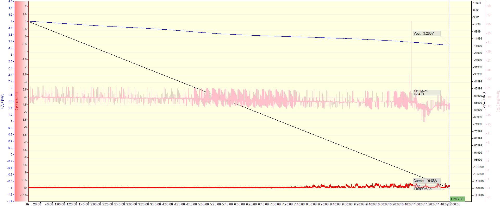 ) tzn. že test probíhal ne do limitního napětí 3V, ale do hodnoty limitní kapacity 117Ah. Vše je patrno z grafu. Napětí na článku bylo 3,285V. Tzn. na 130Ah by se určitě dostal...