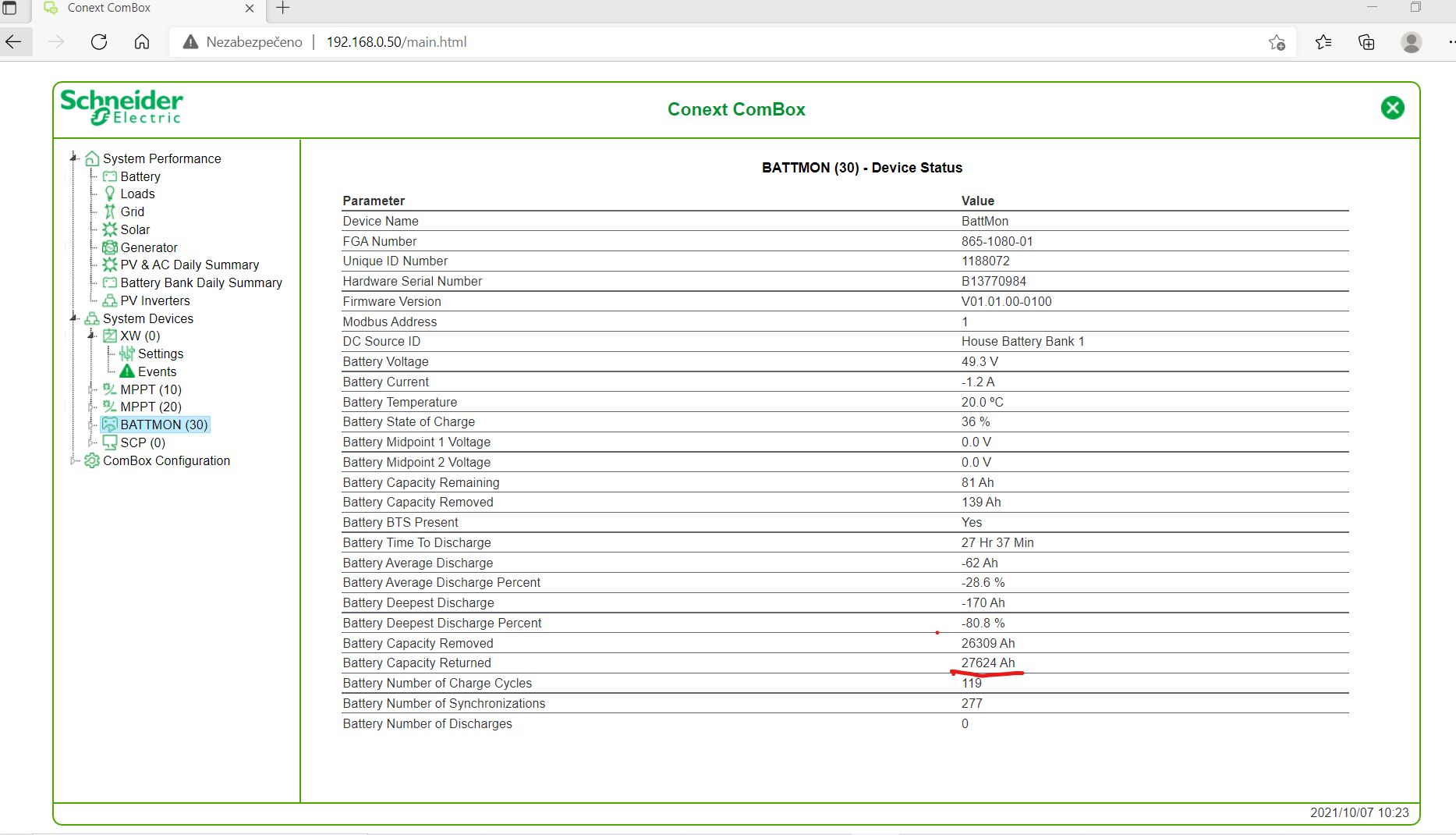 Schneider XW+ 6048, 2,5 kWp panelů.