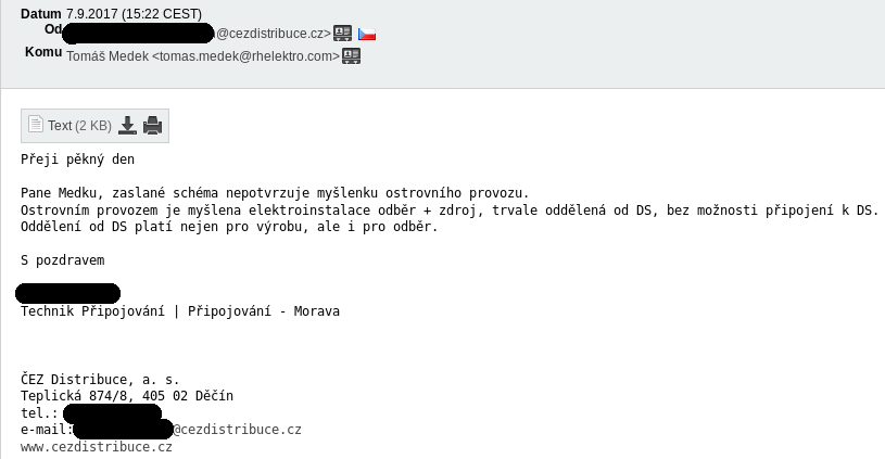 Takže mám od technika ČEZ Distribuce následující informaci písemně: