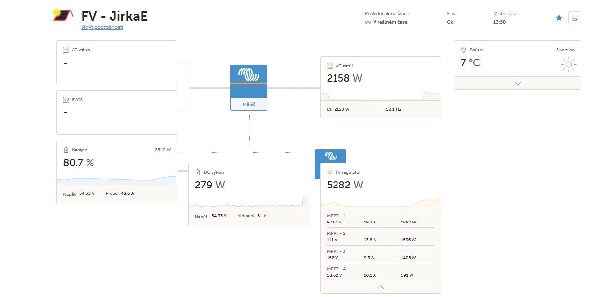 ostrov skoro 8kWp neustále ve stádiu zrodu: smartshunt(ex WBJR), MPPT150/45, MPPT 250/100(ex midnitesolar 150 clasic lite), 16S a různě P cca 340Ah Winston, MP II 5000,( ex Powerjack 8kW, ex samodomo cca 4kW). 48V DC rozvody a spotřebiče.
