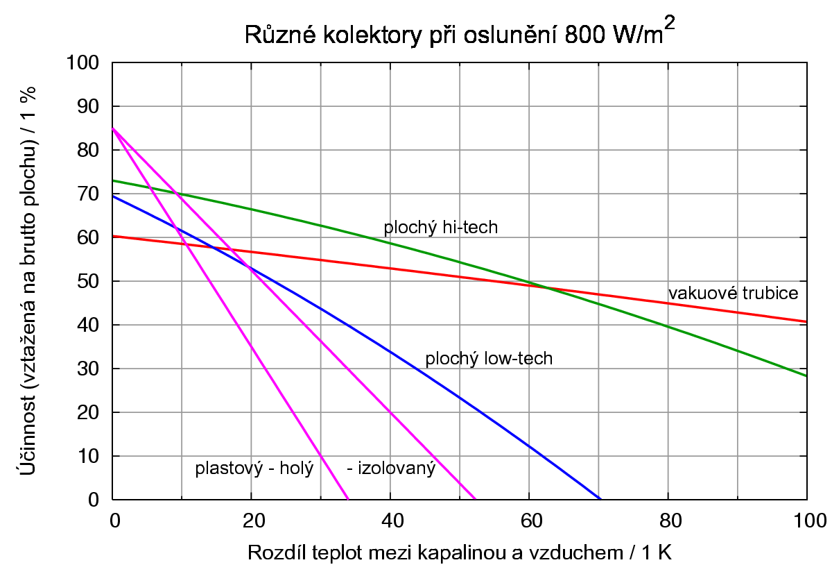 Když jsem zvažoval, jaké termické kolektory pořídit, tak jsem si pro běžně dostupné kolektory z jejich uváděných parametrů spočítal účinost za různých rozdílů teplot média a okolí. Z toho mi vyšlo, že ploché jsou nevhodné za nižších teplot, protože skoro všechno zachycené teplo uteče. Pokud je rozdíl teplot 40 st.C, tak deskový má účinnost 36%, zatímco heatpipe přes 60%. Jen ještě doplnění - princip heatpipe využívá k přenosu tepla fázové přeměny a tento způsob je o několik řádů rychlejší, než přenos tepla vedením a i výkonnější, než přenos tepla prouděním. Proto se používá i na jiných místech.
