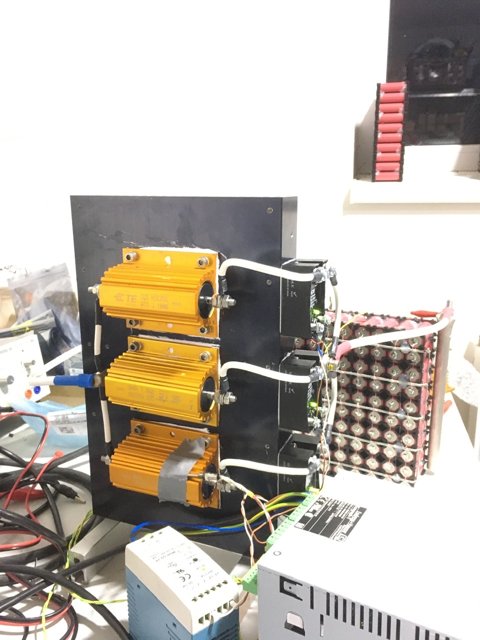 Dám sem pár fotek vybíječe. V podstatě se jedná vždy o odpor 0,1Ohm a SSR, které ho připíná. Celé je to 3x paralelně, asi by šlo i 4x, ale nějak jsem měl pocit, že to už ten chladič nevyzáří. Teď z toho dokážu tahat cca 390W na začátku vybíjení.
