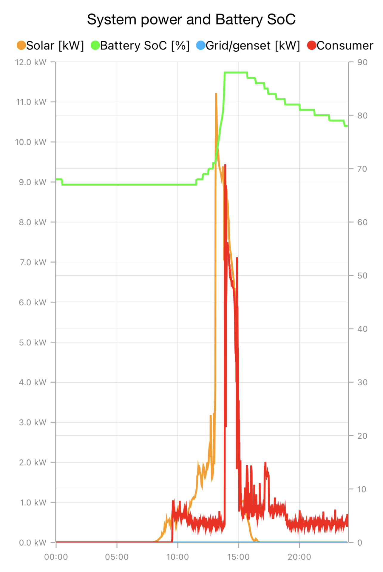 Chvílemi to dávalo přes 11 kW. Takže baterie nabité na 88% a zbytek vytěžování do akumulační nádrže.