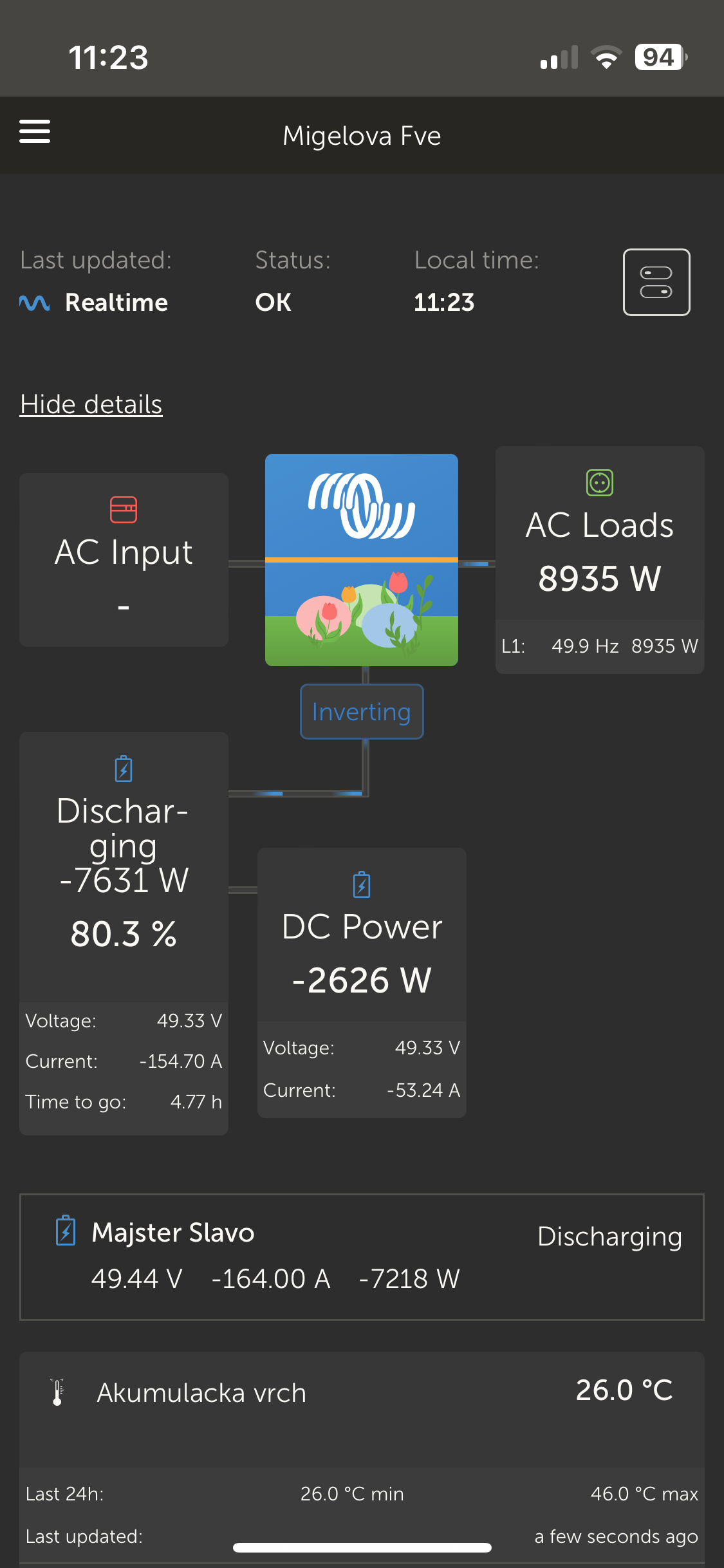 Neska sme prvy krat tahali z baterky vacsy vykon ako sa znich obvykle taha,nakolko sa varilo,pieklo,isiel bojler a aj sa trochu tepla tahalo z klimy tak baterka nam pekne vykompenzovala ten chybajuci vykon ktory nie je zatial v paneloch..z panelov slo nejakych 2kwh a z baterky cez 7kwh a teda nez som si stihol spravit screenshot tak tam bol peek nejakych 9,4kw na AC load z menicov a potom sa to ustalilo na nejakych 8,7kw..