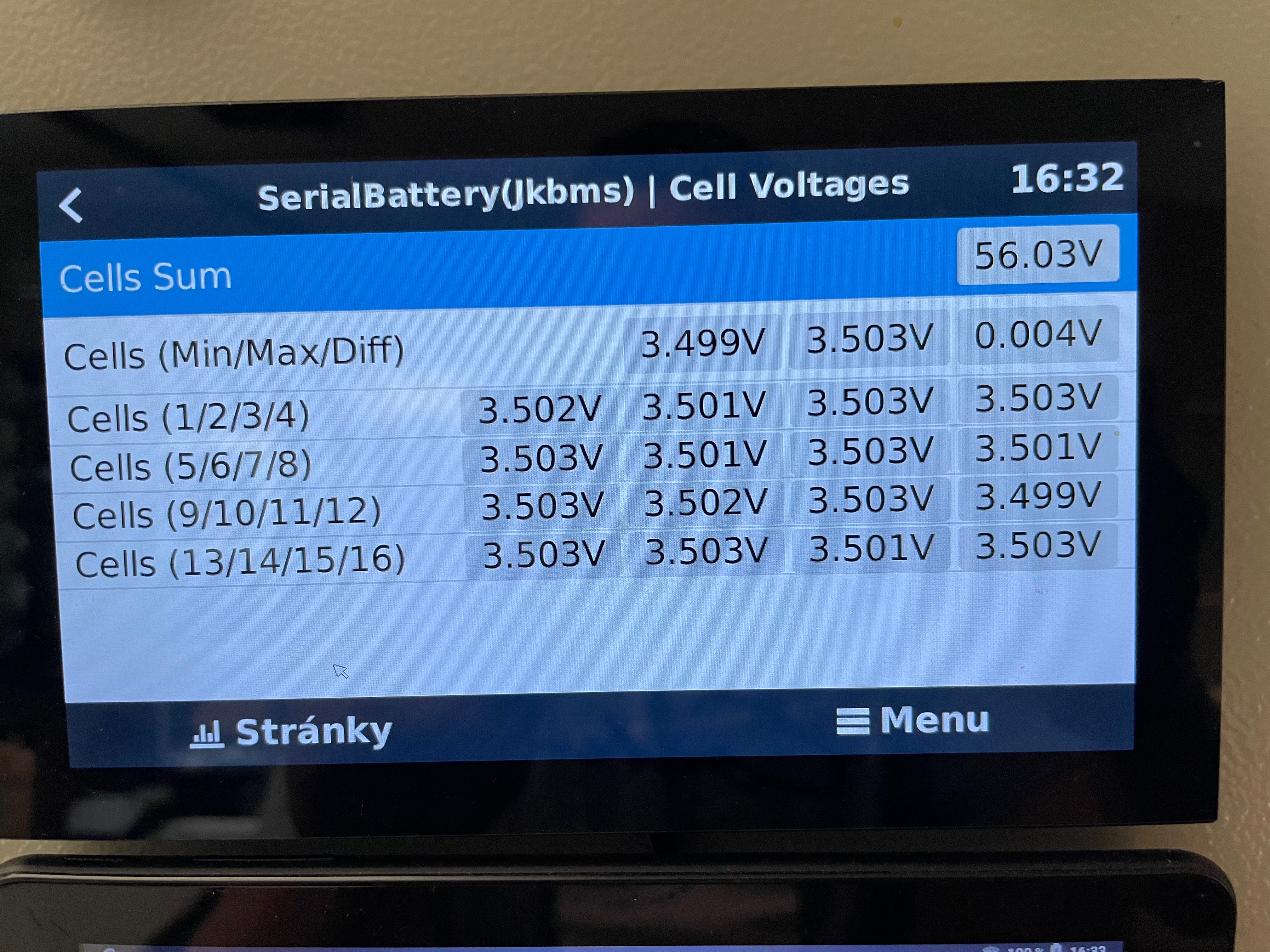 Vyskúšaj, ak ti to aj po top balancingu bude robiť problém, tak si pozri, ktoré články. Môže sa stať, že niektoré články stratili kapacitu. Kamarát teraz meral 280Ah články po 2 rokoch a cca. 250 cykloch a dva články boli okolo 250Ah. Bohužiaľ nemeral ich na začiatku, takže ťažko povedať či mali plnú kapacitu na začiatku.ElektroEzs píše: pon úno 03, 2025 5:03 pmMam JK s 2A balancerem a delal sem top balancing a stejne casem ujede. Zkusim znovu pripojit na Eletek a nechat to vyjet na tech 57,6V a balancovat JKDiablo1st píše: pon úno 03, 2025 4:33 pmMôže, ale ako píše rva, väčšinou to nie je potrebné. Ak sa spraví top balancing tak väčšinou JK nemá problém s balancovaním. Čo si kúpil 0,6A verziu?ElektroEzs píše: pon úno 03, 2025 3:32 pmMuze tohle bezet https://a.aliexpress.com/_Ez2DqHO soucasne s JK BMS balancovanim nebo koupit neco lepsiho? Porad se mi po nejake dobe rozjizdi clanky a JK to pak nestiha uz srovnat. Pripojit na pevno nebo udelat krokosvorky aby se to dalo pouzivat i na dalsi sadu baterek? Diky