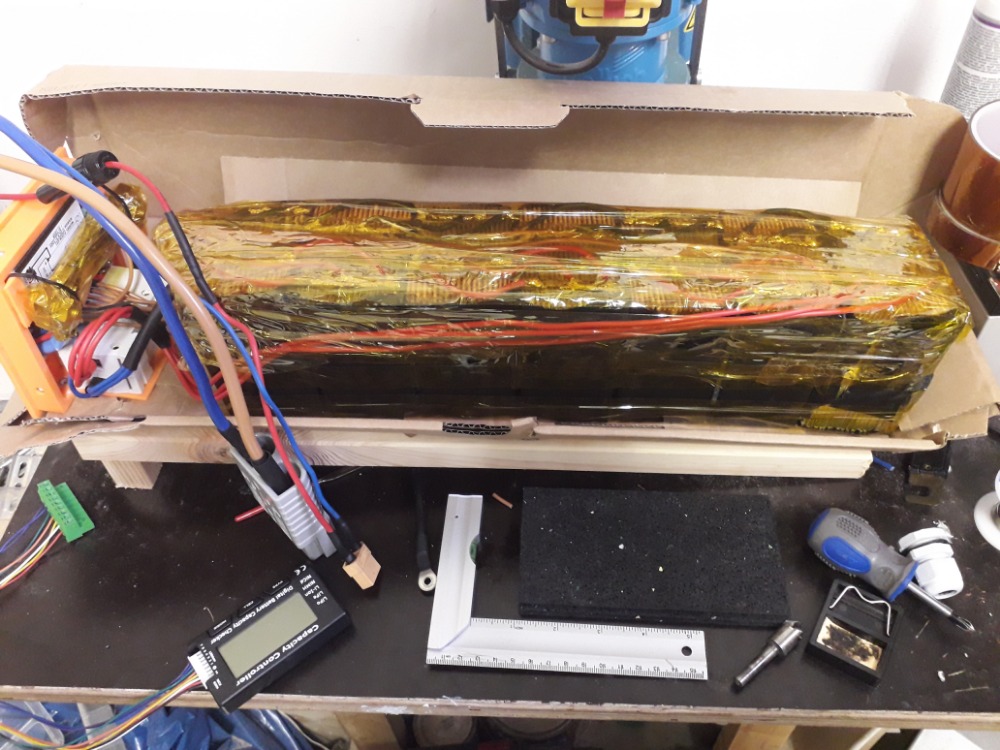 U každého článku jsem vyhodil elektroniku nechal tam jen vratnou pojistku a každá článek pomocí nabíječky iCharger 1010B+ a měřáku YR1030 překontroloval a postupně jsem je spojil do bloků . Spojené jsou pomocí široké sběrnice používané v sol. panelech . a pak třema vývodama propojovány seriově .