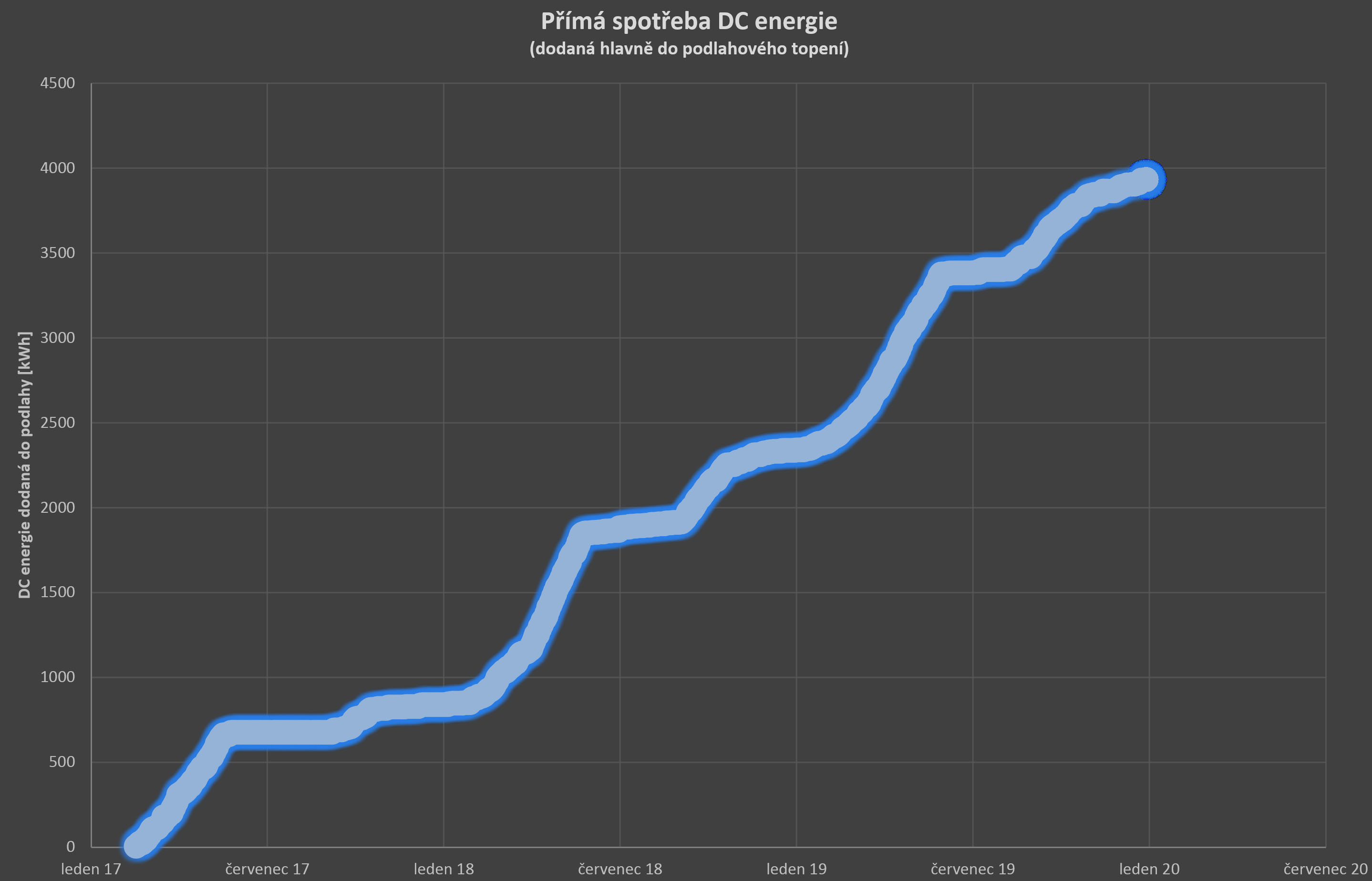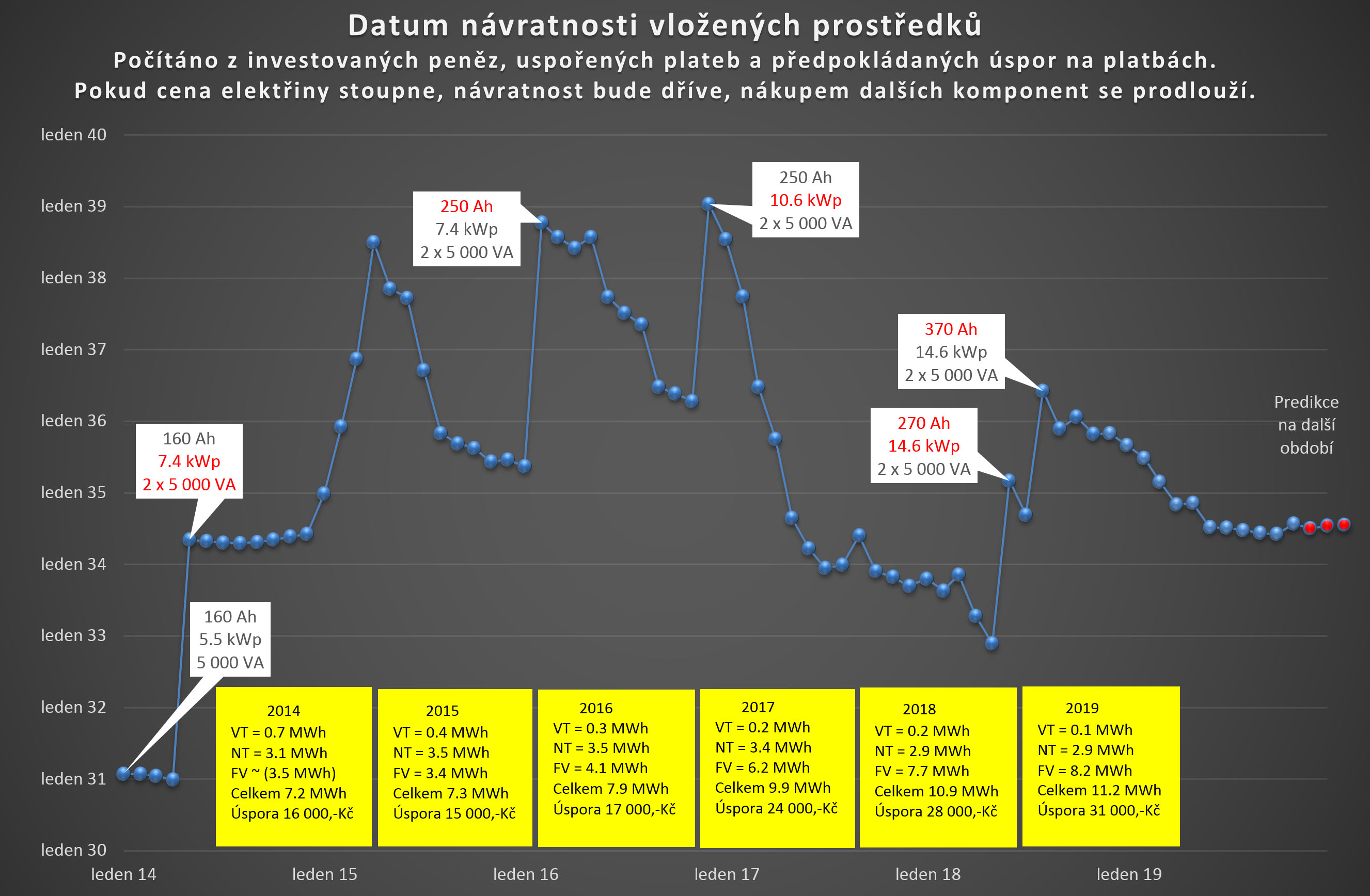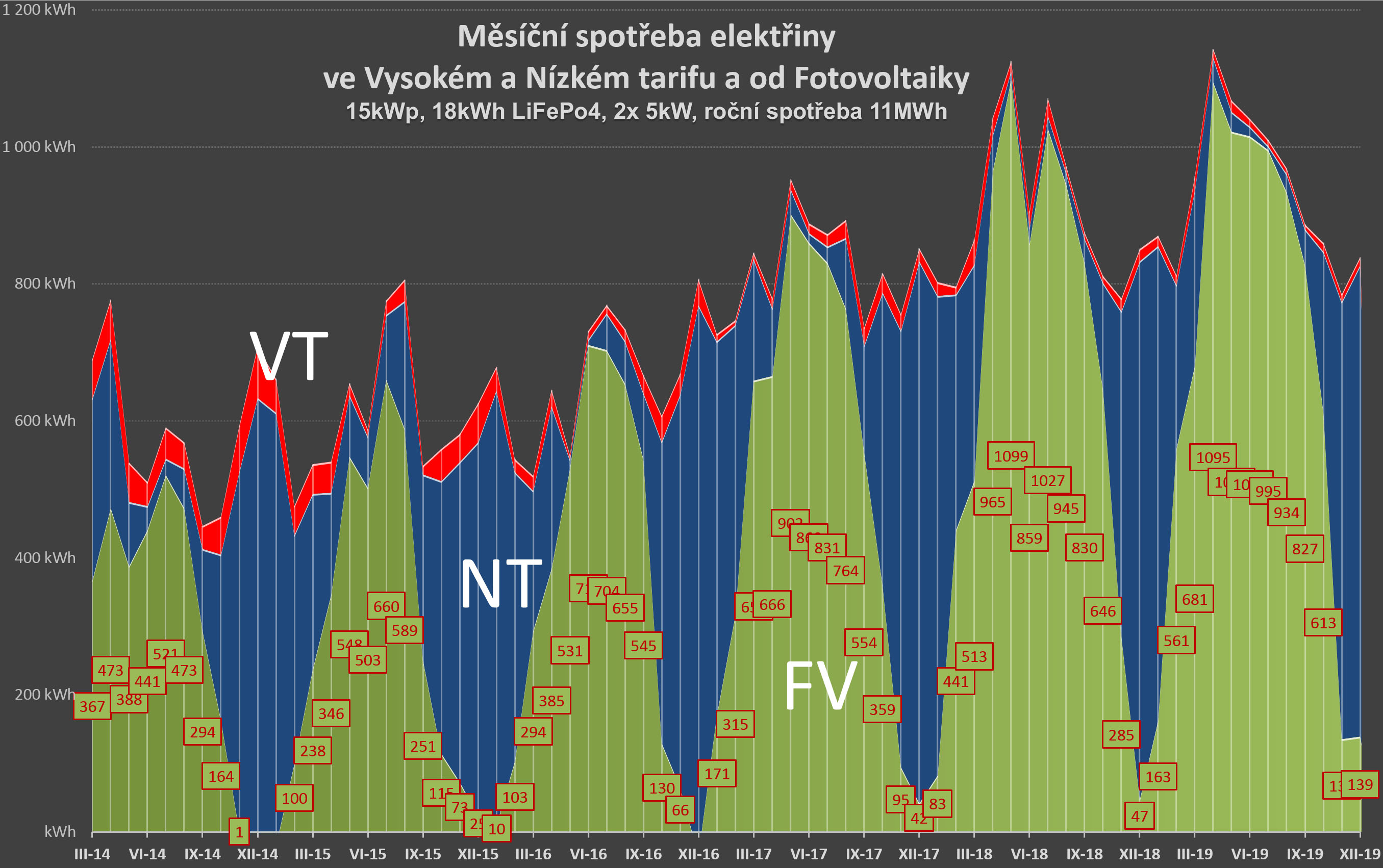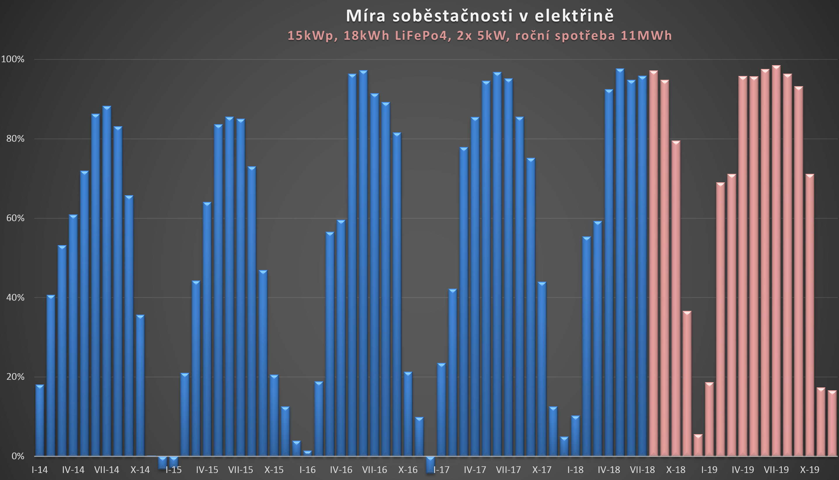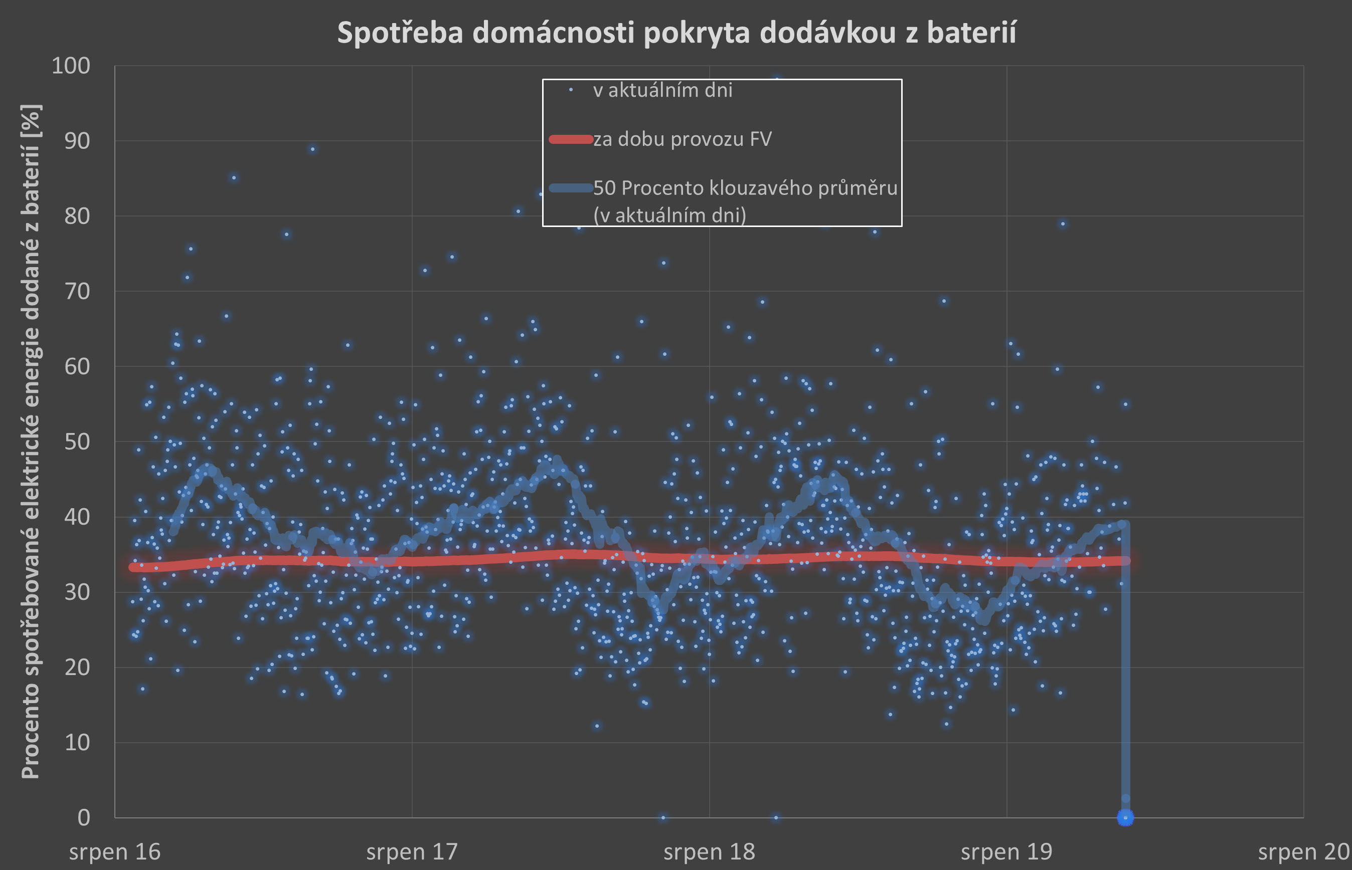 1. Elektrárna funguje jak má, tak není žádná podstatná změna 2. Baterie pokrývají dlouhodobě asi 35% spotřeby domácnosti. Přes léto (protože je dlouhý den) dodávají jenom 25% spotřeby domácnosti, zato v zimě 45%. Ta zbývající elektřina do sta procent se spotřebuje přímo cestou: FV panely -> Regulátor -> Měnič -> Spotřebič, nebo (hlavně v zimě: Nízký tarif -> Spotřebič). 3. Pokud chci dosáhnout vyšší soběstačnosti, potřebuji hlavně více panelů, protože přes zimu je malá výroba.