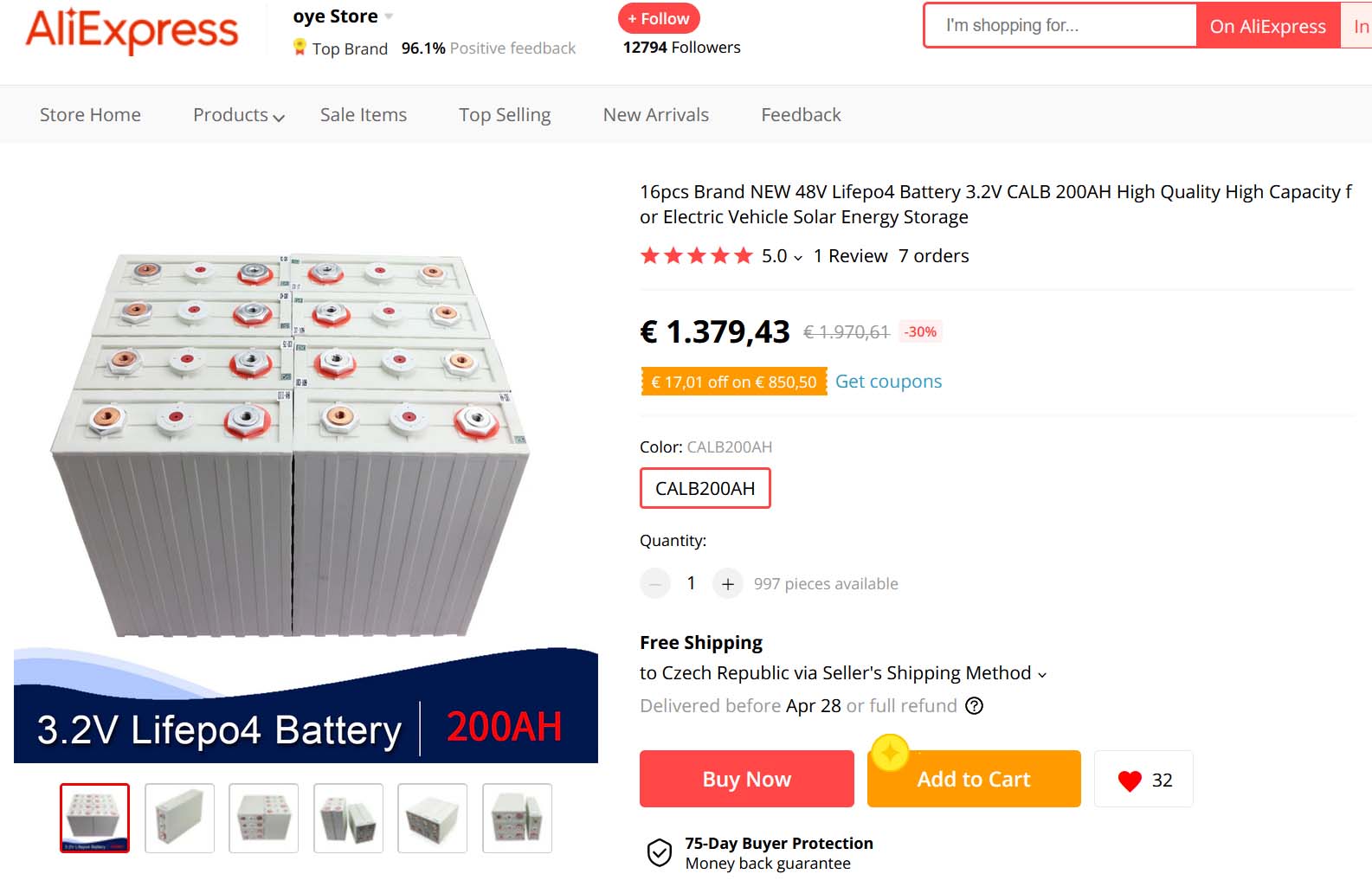 co si to vlastne objednaval za baterky? na tom odkaze som nic nenasiel. prislo ti to bez cla?rva píše:Od Číňana "oye Store" https://www.aliexpress.com/store/4503091 přišly po téměř 3 měsících (jely vlakem) články 16 x 200 Ah za 1 345 EUR - objednával jsem šedé, ale psal, že nejsou, tak ať zaději beru modré s lepšími parametry = modrý plast bez jakéhokoliv označení.