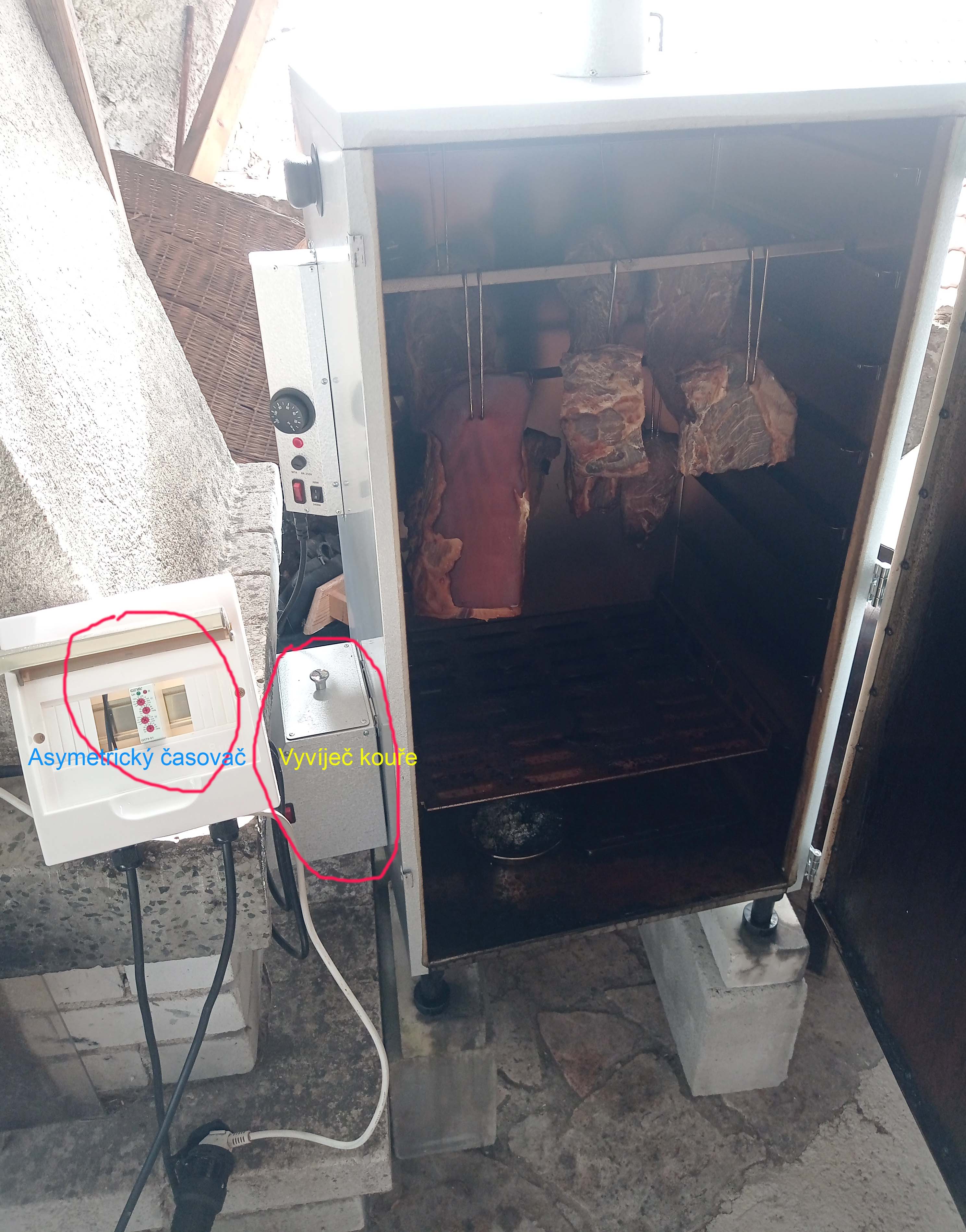 Vzhledem k tomu, že elektřiny je po většinu roku dostatek (spíš nadbytek), pokračuje přechod s dalšími spotřebiči na elektriku. Pořídil jsem elektrickou udírnu (ohřev je elektrickou topnou spirálou 700/1400 W hlídán termostatem), u které je vyvíječ kouře (šnekem se pomalu posunuje štěpka na topnou spirálu, kde produkuje dým). Udírna má izolované stěny, takže na omak je vlažná. Odhadem je spotřeba štěpky tak 2 litry za 24 hodin. Zdálo se mi, že je to celkem dost, z komínku se hodně kouřilo, tak jsem ještě v průběhu prvního uzení splácal z asymetrického časového relé mezikus, přes který je připojen vyvíječ kouře. S nastavením 5 minut vyvíjení kouře a 5 minut odpojením bylo dokončeno první uzení (16 hodin) s výsledkem, který pravděpodobně moc dlouho na háku viset nevydrží: