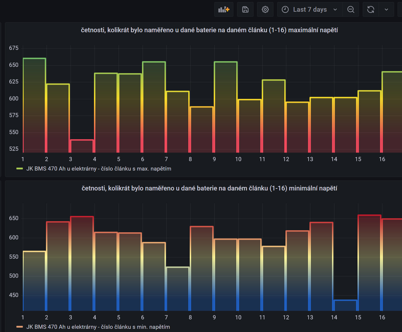 A článek 14 vypadá, že má možná vyšší kapacitu, protože je na něm málokdy nejnižší napětí. BMS mám nastaveno na balancování mezi články když je na nich vyšší napětí než 3.3 V, což je v podstatě top balancování když jsou články nabité.