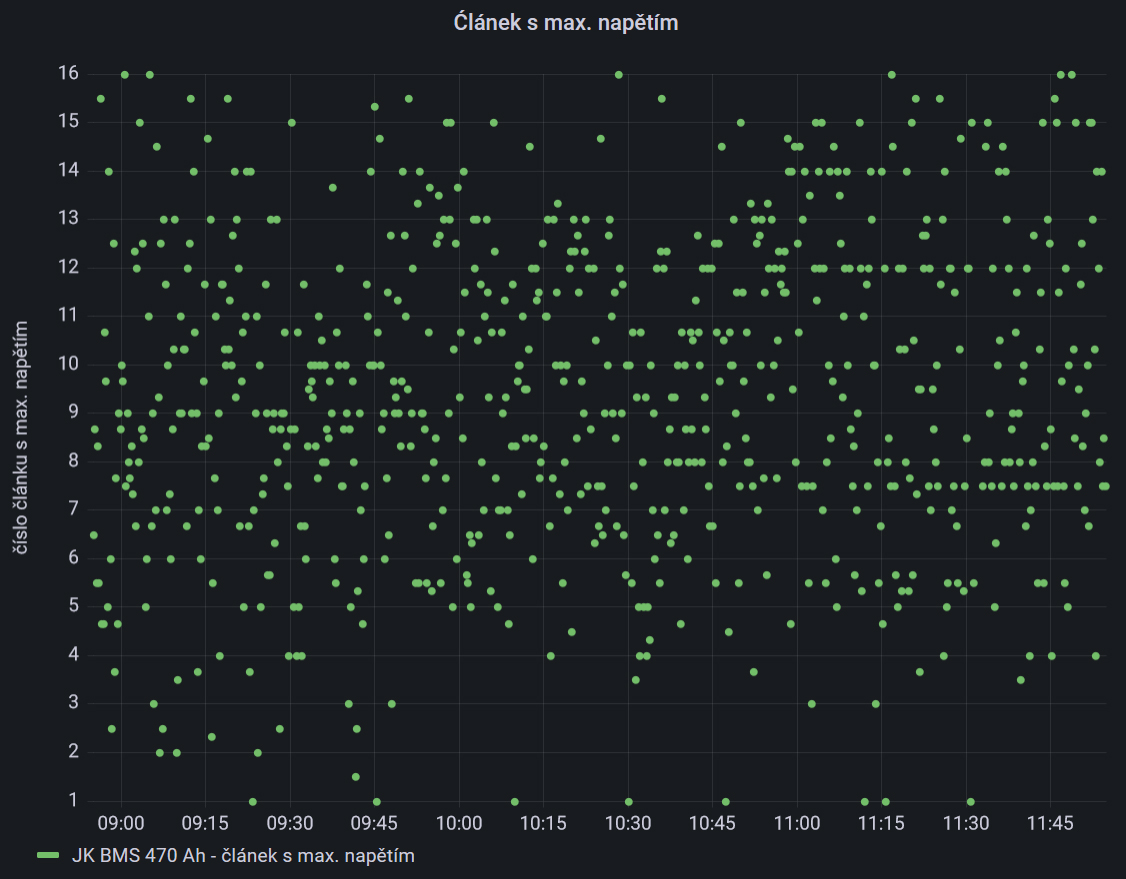 Při integraci JK-BMS do Home Assistant přes ESPHome (je potřeba další hardware s wifi+BlueTooth - např. ESP32, návod dle https://github.com/syssi/esphome-jk-bms ... ample.yaml) se pak z BMS vyčítá spousta entit. Kromě jiného i číslo článku, na kterém se naměřilo maximální (popřípadě minimální) napětí. Vypadá to nepřehledně, každou chvíli je nejvyšší napětí změřeno na jiném článku: