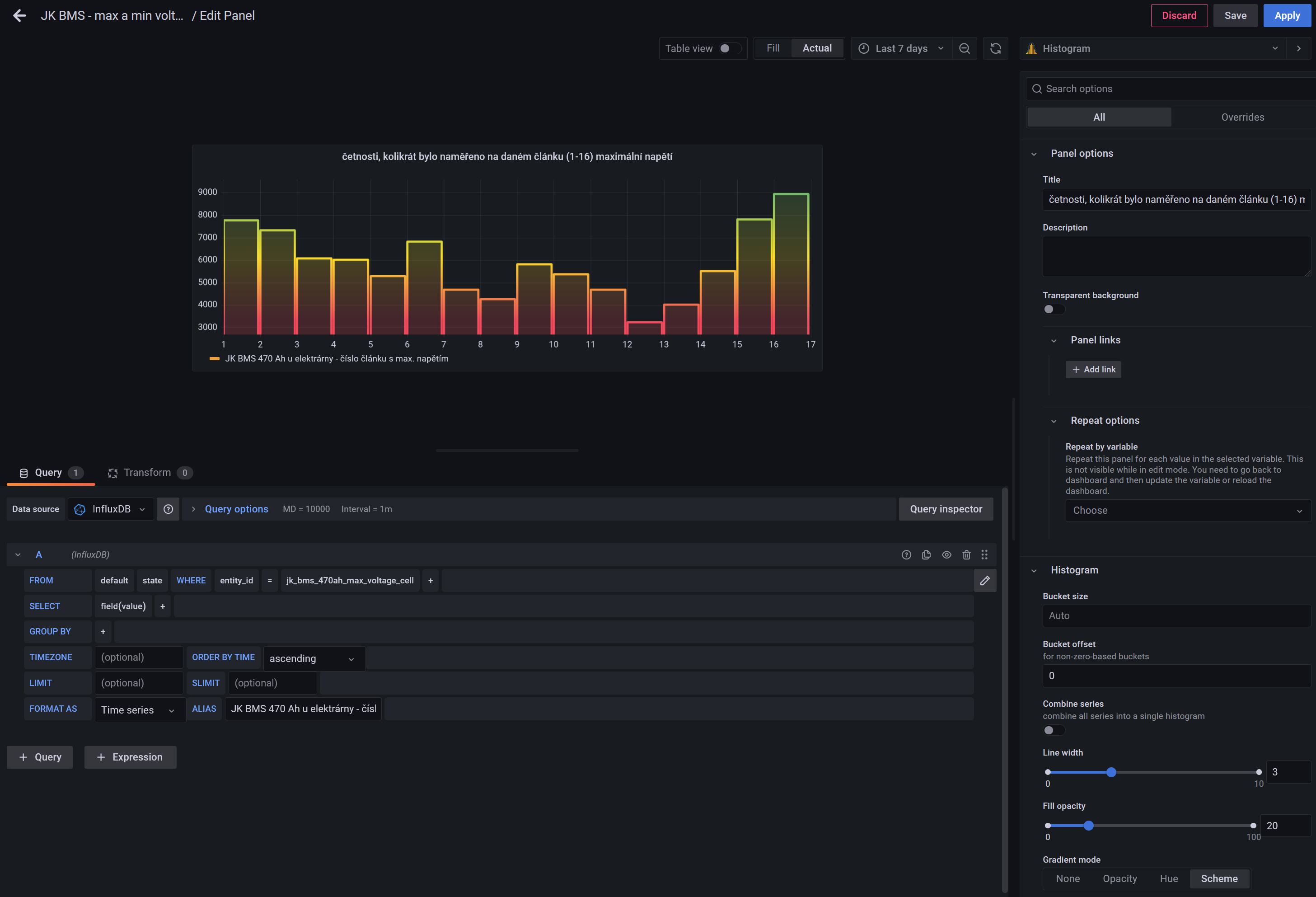 Raději jsem si data z influx exportoval do excelu a kontrola v něm vede ke stejnému histogramu který je snad udělán ze všech uložených hodnot za posledních 7 dní.