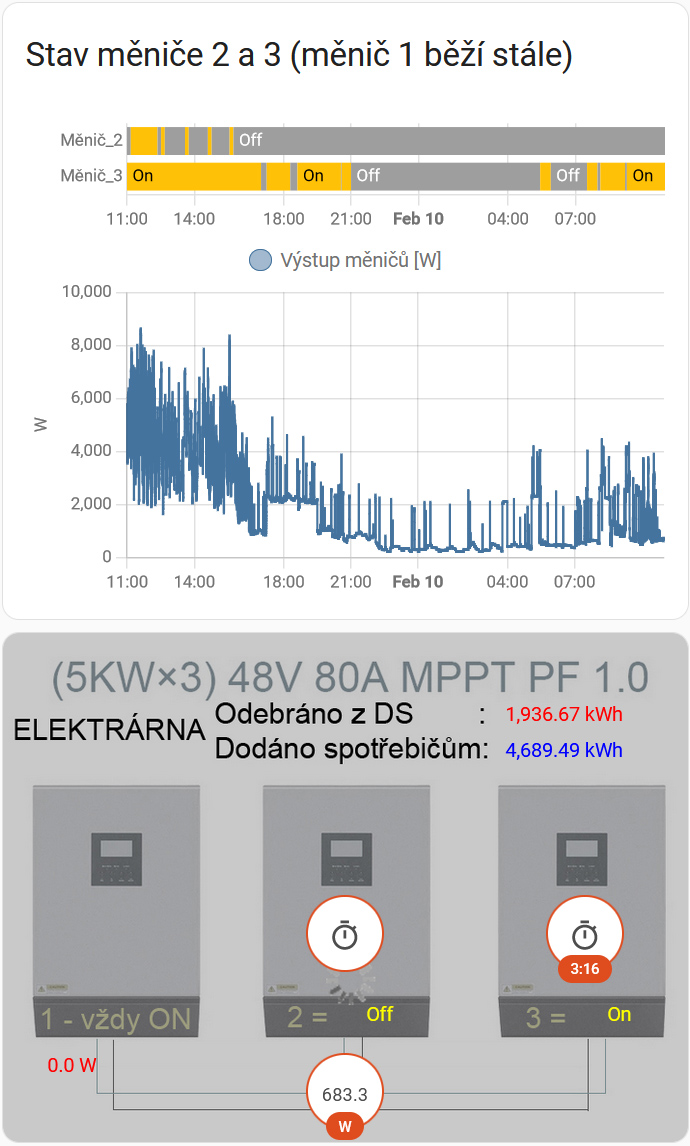Ostrov. Aktuálně v provozu 15 kWp 12+10+10 55°jih, 30kWh 48V + 3kWk 12V Lifepo4 a 2x Easun smp 5kW sfázovaný + 3x Must mppt 6kW + UPS 12V 500Va + 3F měnič 3x400V 6kW.