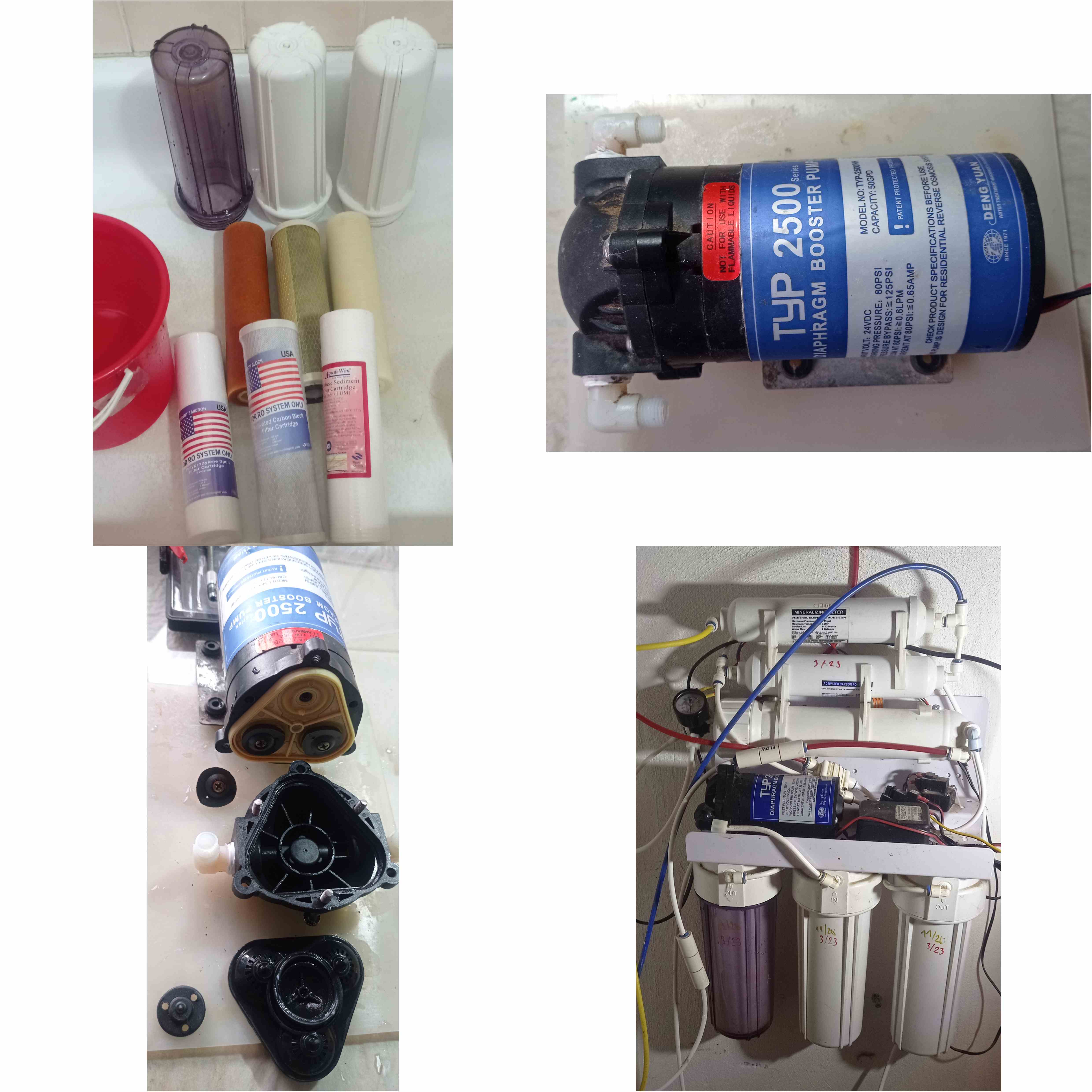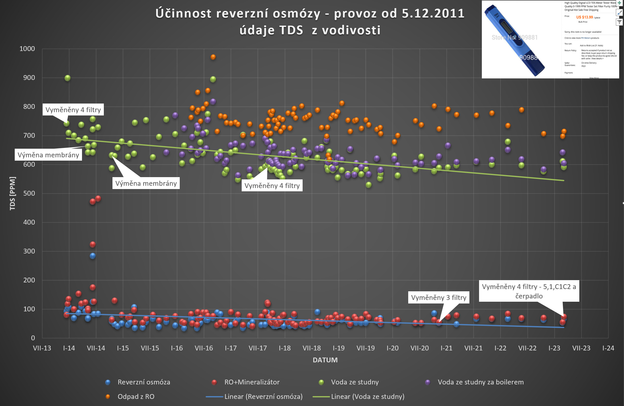 K samostatnosti patří i vlastní zdroj vody. Z nepitného 40m vrtu (vysoký obsah dusičnanů a nějaké bakterie) vyrábím reverzní osmózou nezávadnou vodu. Při pravidelné údržbě došlo konečně i na posilovací čerpadlo, které spolehlivě sloužilo od roku 2011, tedy přes 10 let bez potřeby jakékoliv údržby. Teď po výměně filtrů dávalo malý tlak (260 kPa), tak ho nahradilo rezervní, které možná 5 let čekalo na svůj čas (to dává optimálních 500 kPa). Původní ani po rozebrání nevykazuje nic podezřelého, je to zajímavá konstrukce 3- membránového čerpadla. Ani nebylo moc co k čištění, snad jen ty pryžové díly jsou tvrdší. Po smontování čerpá, tak někdy ověřím výstupní tlak. Vlastní membrána reverzní osmózy tam je už přes 8 let, po kontrole vypadá normálně, tak jsem ji opět vrátil. Čerpadlo, membránu a drobné díly této stavebnice mám rezervní z Číny, filtry 1 a 5 mikrometru, uhlíkové filtry a mineralizátor jsou od místního obchodu mangala.cz. Kvalitu kontroluji sporadicky měřákem TDS z Číny