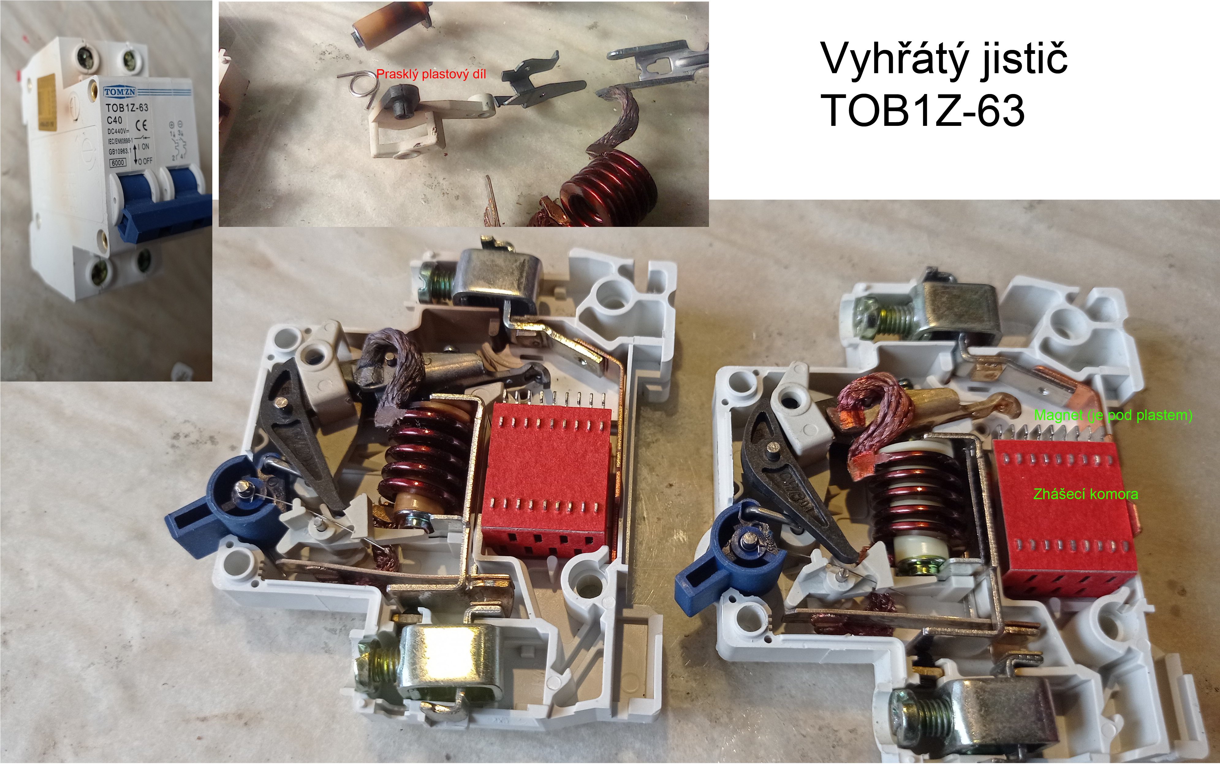 Do vyhřívání podlahy pouštím DC proud 26 A z baterie přes DC jistič. A ten se stal pro elektřinu neprůchozí. Během několika let ani jednou nemusel zareagovat, párkrát jsem ho vypnul v rámci údržby. Je na 440 V DC a skládá se ze dvou identických jističů. Vypadá to, že už od výroby měl jeden plastový díl trhlinu a kvůli tomu nebyl dostatečný přítlak kontaktu. Po letech stoupl přechodový odpor, okolí se vyhřálo a kontakty se přerušily. Uvnitř je zhášecí komora, pod plastovým krytem magnet pro vychýlení oblouku do zhášecí komory.