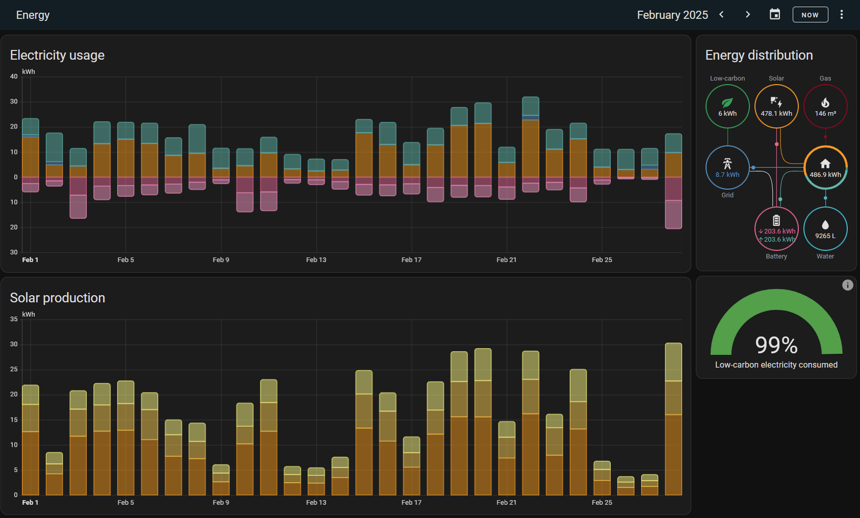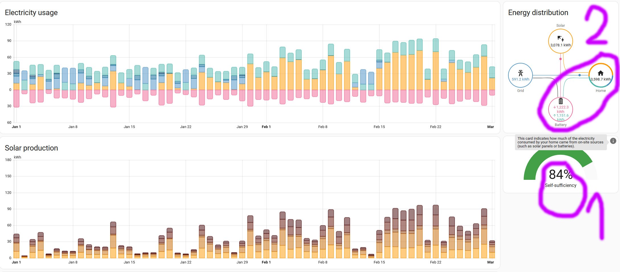 V HA u energy dashboard přidali míru soběstačnosti (tady to je od začátku roku 84 %), takže si to člověk nemusí počítat jinde. Ještě by tam mohli přidat míru pokrytí spotřeby z baterií, aby bylo vidět, jak jsou baterie důležité. Tady by to bylo 1151.6 kWh_z_baterie / 3598.7 kWh_celková_spotřeba__domu = 0.32. Tedy baterie pokrývaly 32 % spotřeby domácnosti. A nebýt baterií, tato spotřeba by se musela odebrat od distributora.