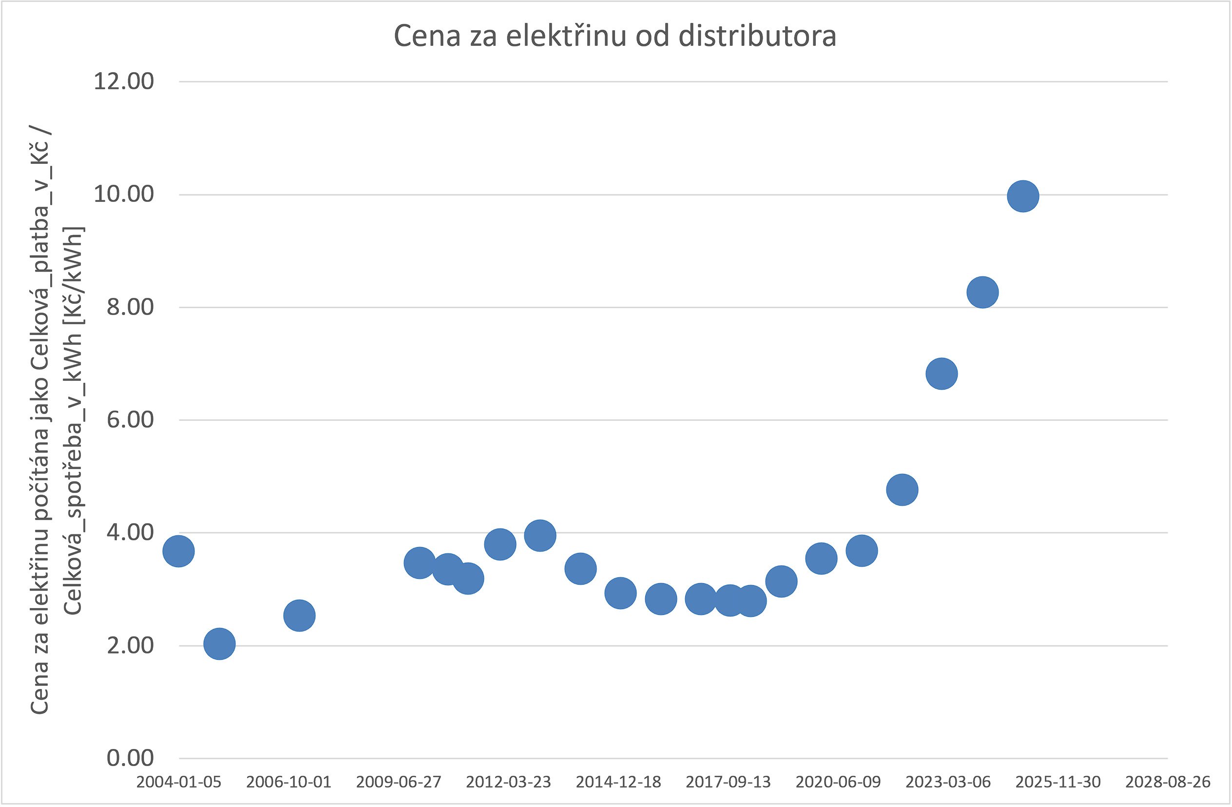 Jak se u baráku za posledních 20 let vyvíjela cena za elektřinu od distributora. Různí dodavatelé, různá spotřeba. Od roku 2013 začala fotovoltaika.