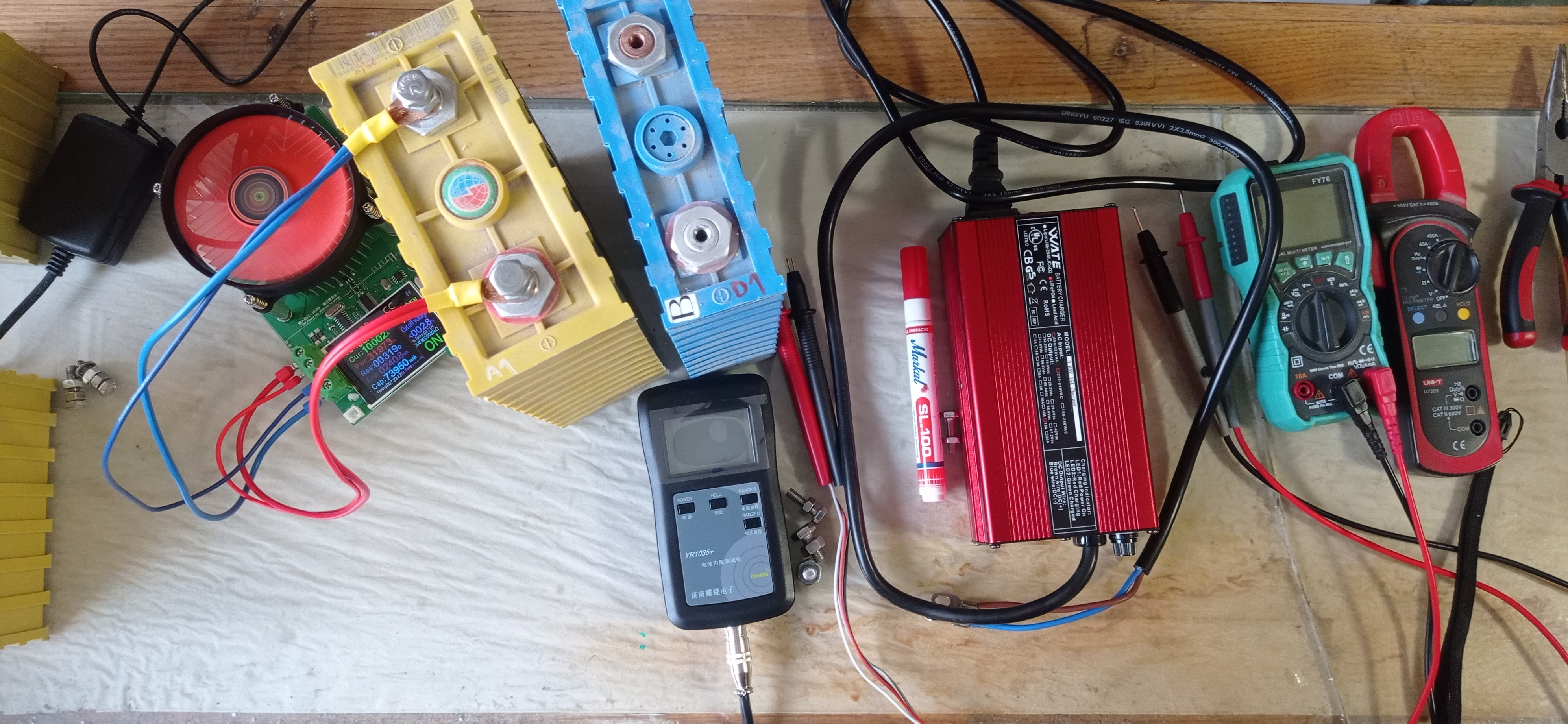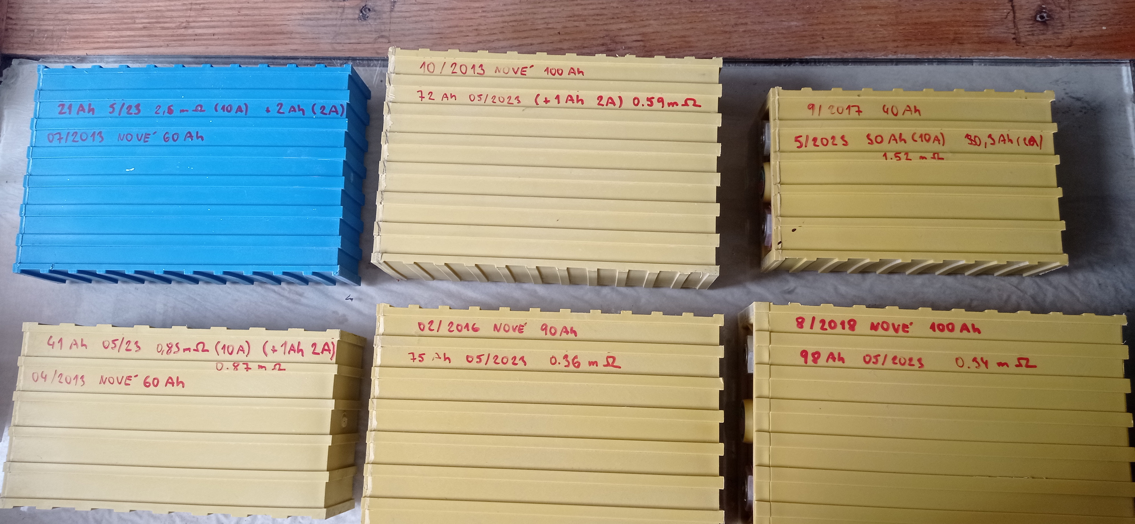 Využil jsem to na změření kapacity prvního článku z každé sady. Nabit na 3.65 V a pak vybíjen proudem 10 A do 2.8 V. Následně ještě vybit proudem 2 A. Žluté články jsou známé Winston, modrý je nějaký noname označen jako B kvalita.