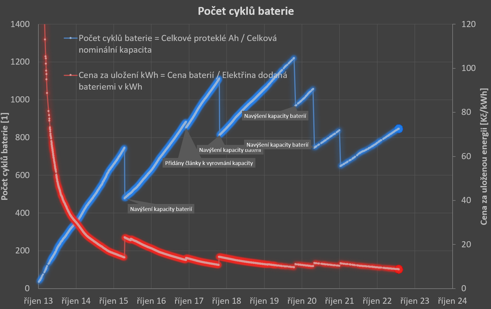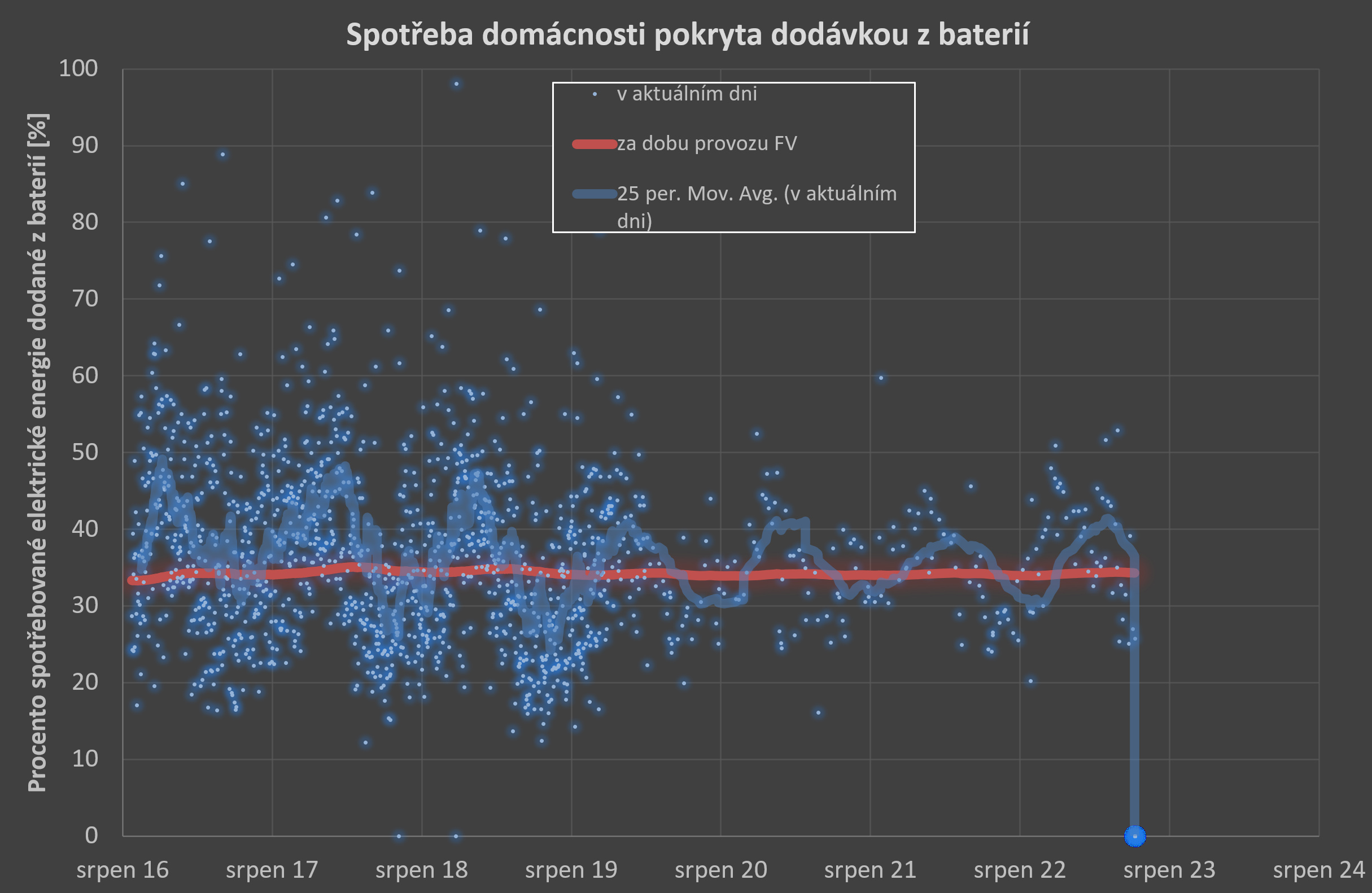 Kromě úplného začátku jsem o ně snad pečoval řádně. Pracovaly teda i přes zimu, kdy jsem přečerpával elektřinu z NT do VT. Ani se nedá říct, jestli kapacita klesla kvůli používání (cyklování), nebo stářím. Nekteří tady snad mají baterie déle a kapacita jim tak neklesla. Protože sleduji proudy do /z baterií, vím, kolik bateriemi celkem proteklo a průběžně mohu sledovat "cenu" za uložení elektřiny (aktuálně cca 8 Kč/kWh) a zprůměrovaný počet cyklů za celou sadu (cca 850). Vede to ke známému závěru, že z hlediska ceny je nejlepší elektřinu spotřebovat hned jak se vyrobí, protože pak jde cestou FV panely - regulátor - měnič - spotřebič, což je mnohem levnější, než když jde elektřina ještě přes baterie. U mě jde přes baterie zhruba třetina spotřeby domácnosti - přes léto je to méně, přes zimu více.