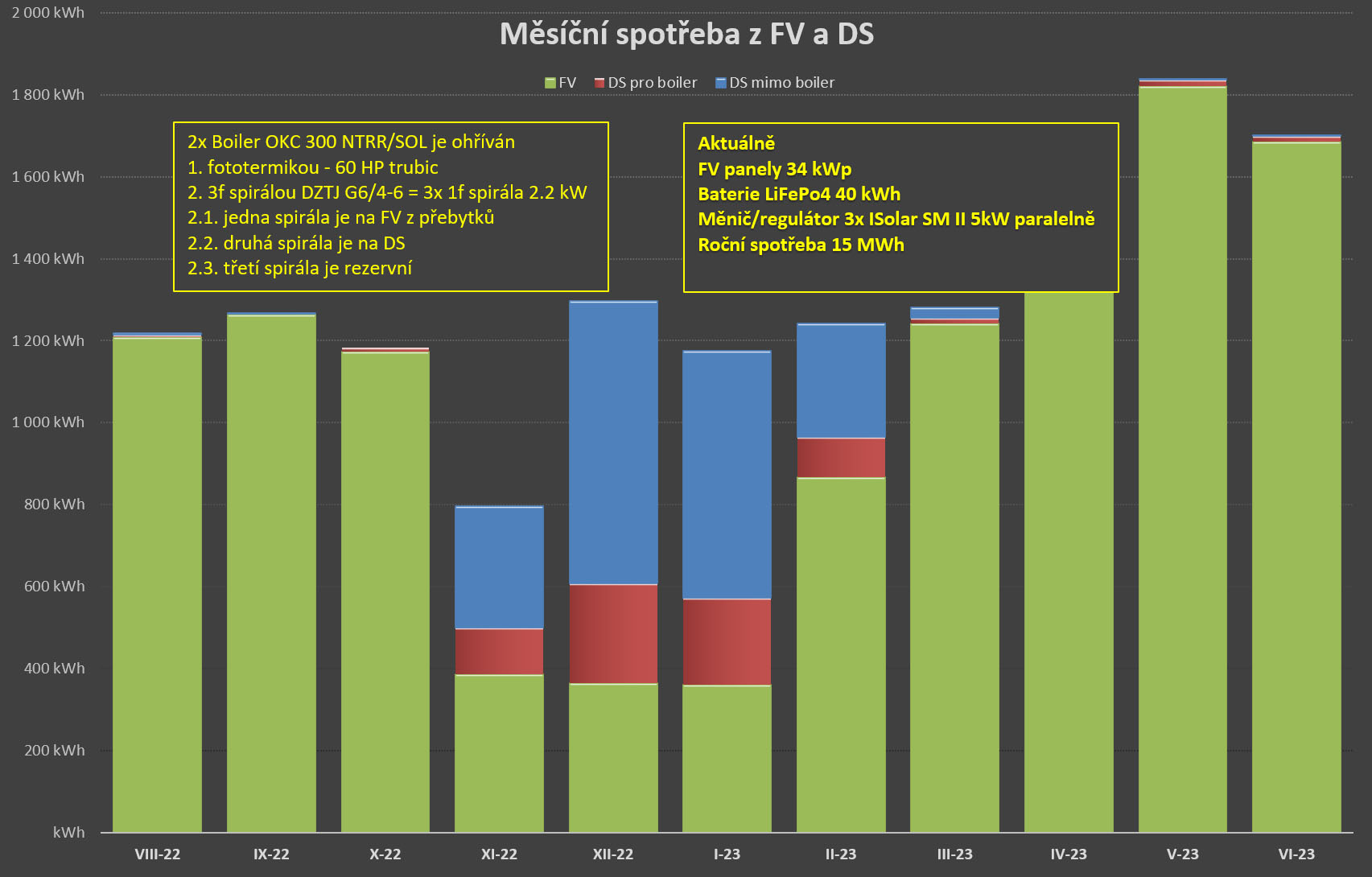 1. Vzít paletu FV panelů a jejich cca 15 kWp (36*410 Wp) by v prosinci dodalo zhruba to, co boiler potřebuje. Cenově to představuje panely (80 tis Kč) + AL konstrukce/kombišrouby (25 tis.) + solární kabel 6mm 2x100m (6 tis.) = přes 100 tis. Kč