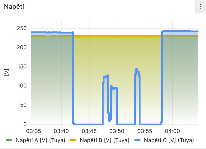 Dnes tu měl v noci ČEZ nějaký krátký výpadek. Protože na něj nemám nic zapojené, tak to zjistím až zpětně z průběhu napětí, které měří 3f smart proudojistič. Dříve tady byly výpadky mnohem častější, teď už je to spolehlivé téměř jako vlastní fotovoltaika.