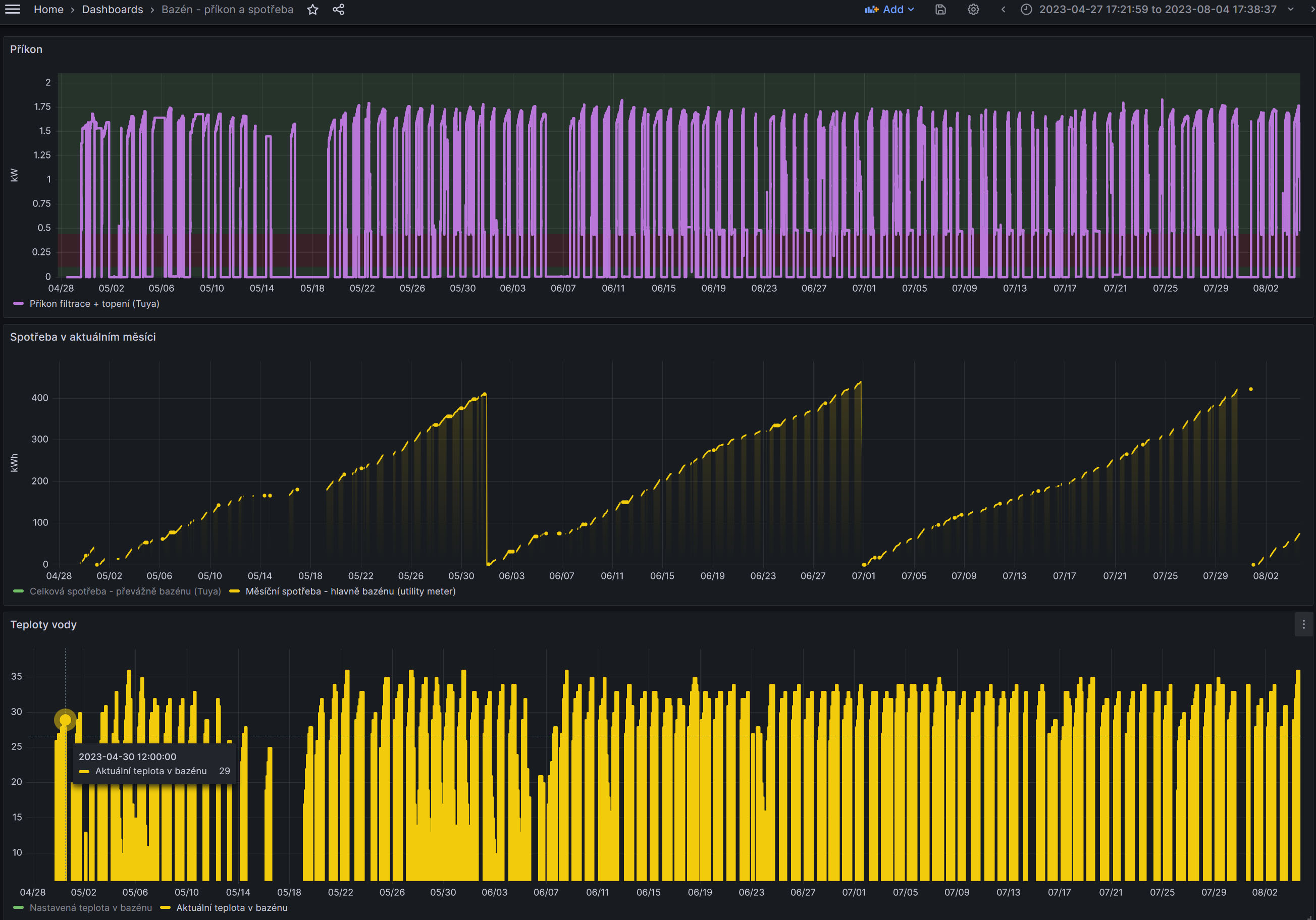 Měsíčně si tepelné čerpadlo vezme cca 400 kWh. Kdybych volil dnes, možná by místo tepelného čerpadla pro bazén byl monoblok, který by sloužil přes sezónu k ohřevu bazénu a po skončení koupací sezóny by ohříval nebo předehříval vodu do boileru, popřípadě podlahového topení.