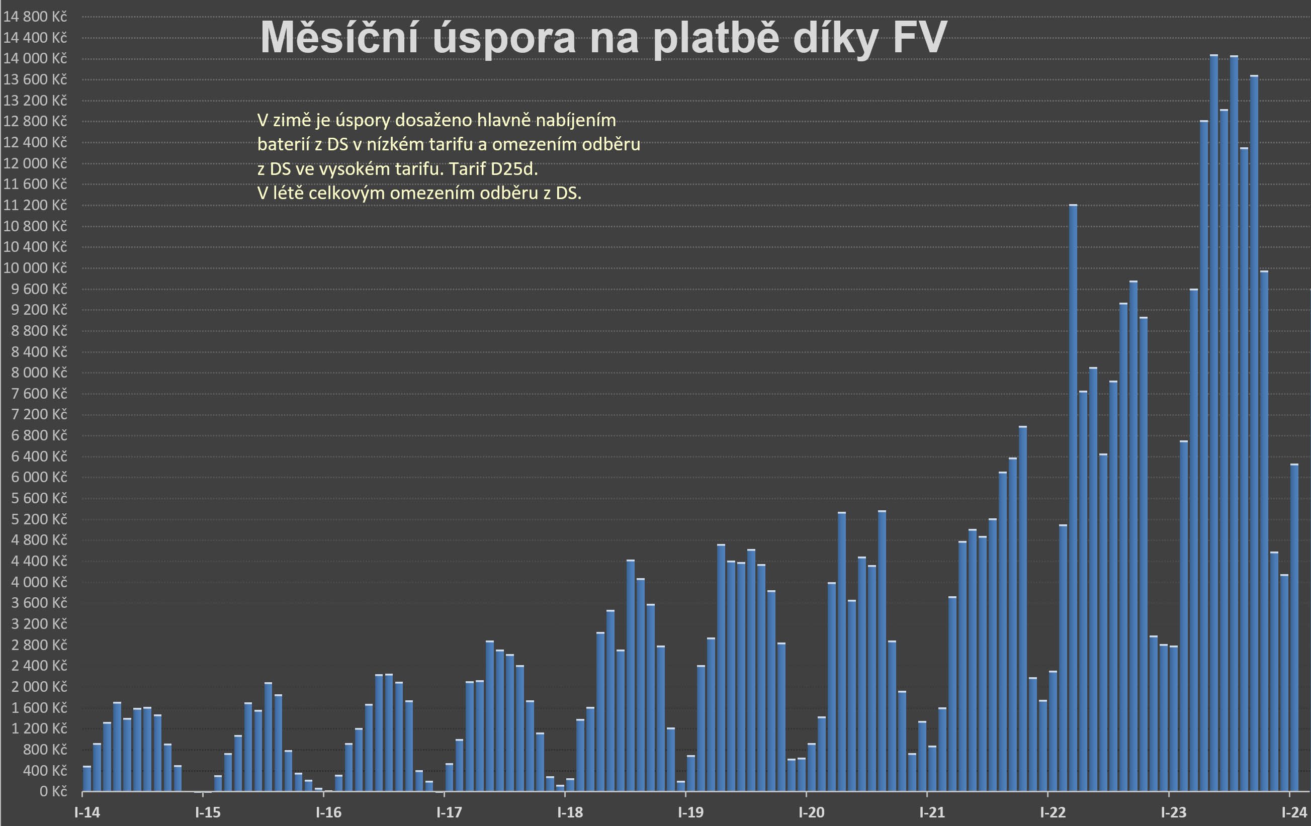 Když to zhruba sleduji, tak to vypadá nějak takto: A odhad měsíční úspory: Při takové měsíční spotřebě elektřiny: Se míra soběstačnosti změnila na: Elektrárnu předimenzuji proto, abych zvedl soběstačnost v zimě. A to hlavně na straně FV panelů, protože v zimě chybí výroba. Měniče výkonově stačí stejné jak v zimě tak v létě. Přebytky po zbytek roku umožňují realizovat to, co bych jinak nedělal. Pořízení tepelného čerpadla bazénu nebo klimatizací představuje jediný jednorázový výdaj, který to znamená, protože elektřina na provoz je zdarma.